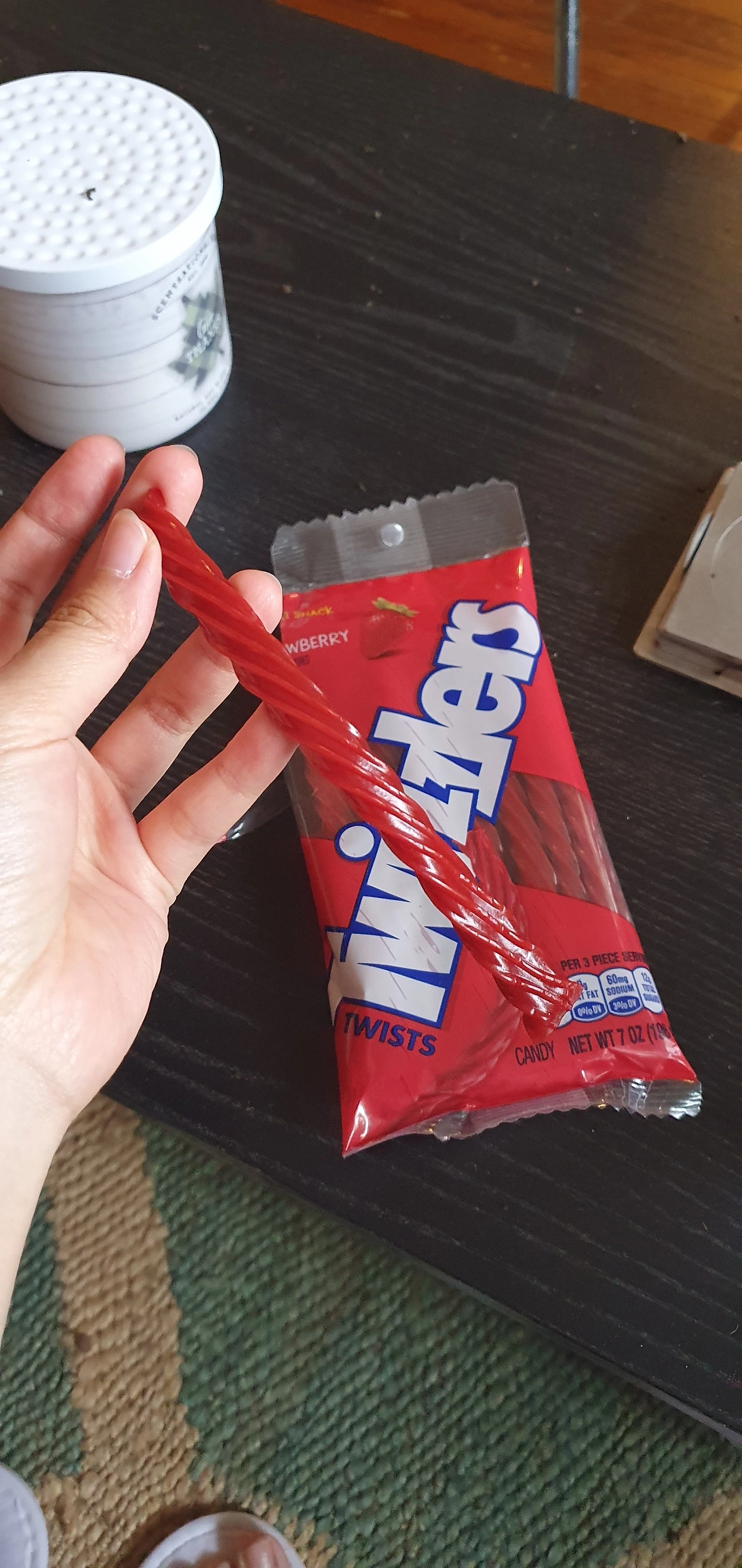 과자 종류로는 (1) 치토스 화이트 채다 맛, (2) 팝 타르트 시나몬 맛을 시도해 봤는데 둘 다 한국에 없는 맛이어서 처음 맛보고 눈이 동그래졌었다. 역시, 군것질이 최고다. 마지막, 제일 좋아하고 애정하는 젤리 파트다. (3) 트위즐러 딸기맛, (4) 스윗아츠 로프 젤리 딸기맛이다. 트위즐러는 남편과 내가 공통적으로 사랑하는 젤린데, 남편에게는 먹다만 미국 물의 향수를, 나에게는 원어민 선생님이 퀴즈를 맞힐 때마다 한 줄씩 주던 향수를 선사하곤 하였다.