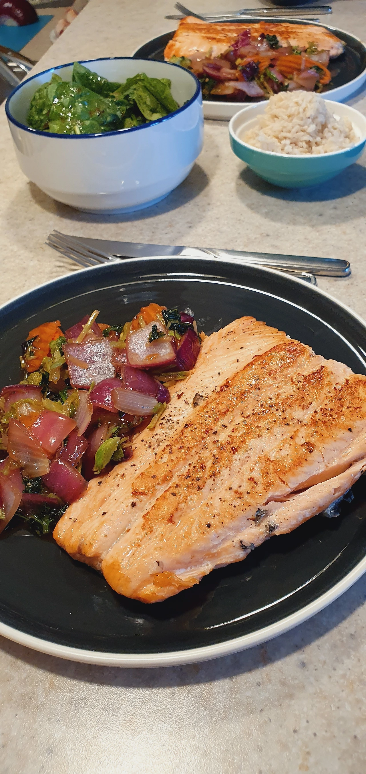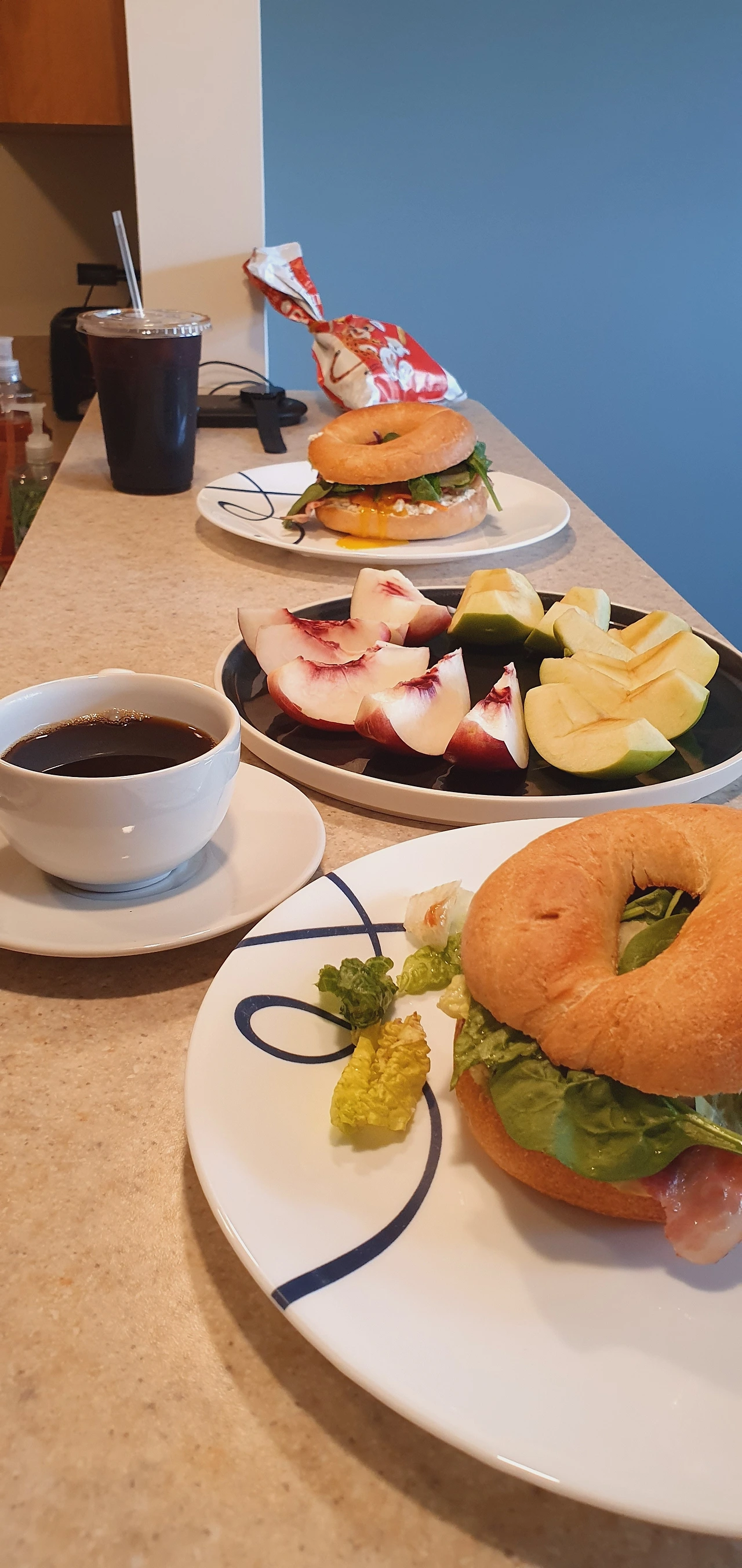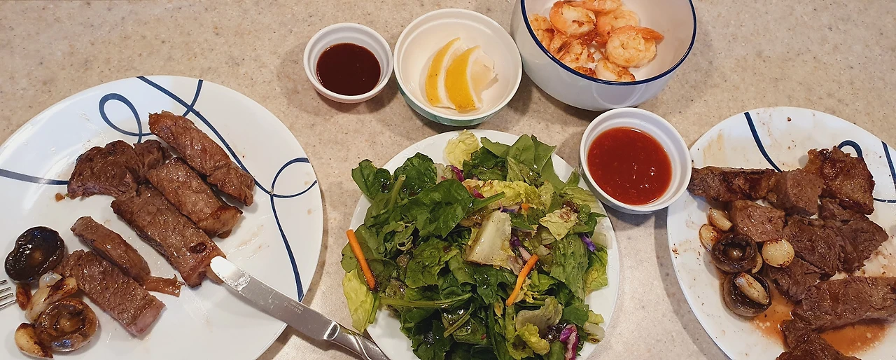 꽤나 재미가 쏠쏠했던 장 보기를 마치고, 여러 식재료들을 지지고 볶아 간단히 요리해 봤다. 여태까지는 마트에서 쉽게 구입할 수 있는 재료들로 주로 양식을 많이 해먹었다. 사진 순서대로 연어 스테이크와 구운 야채(1, 2) > 스테이크와 샐러드, 구운 새우(3) > 아침으로 먹는 시나몬 롤과 캡슐커피(4) > 시금치 스파게티(5) > 베이글 샌드위치와 천도복숭아, 초록사과(6,7)다. 최근에는 한식 재료들을 섭렵하여, 차차 한식도 도전해 볼 계획이다.