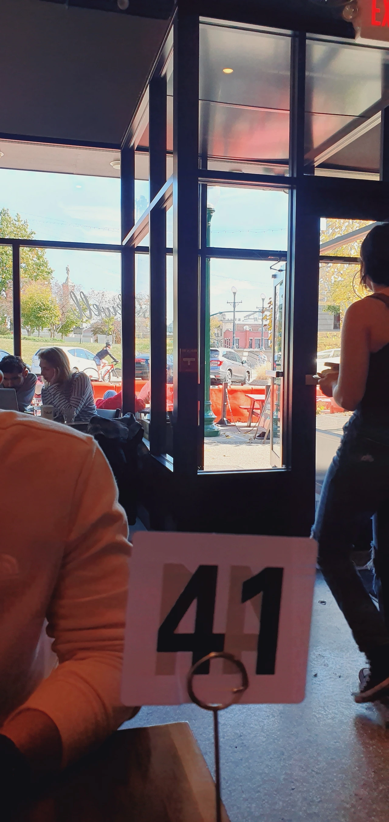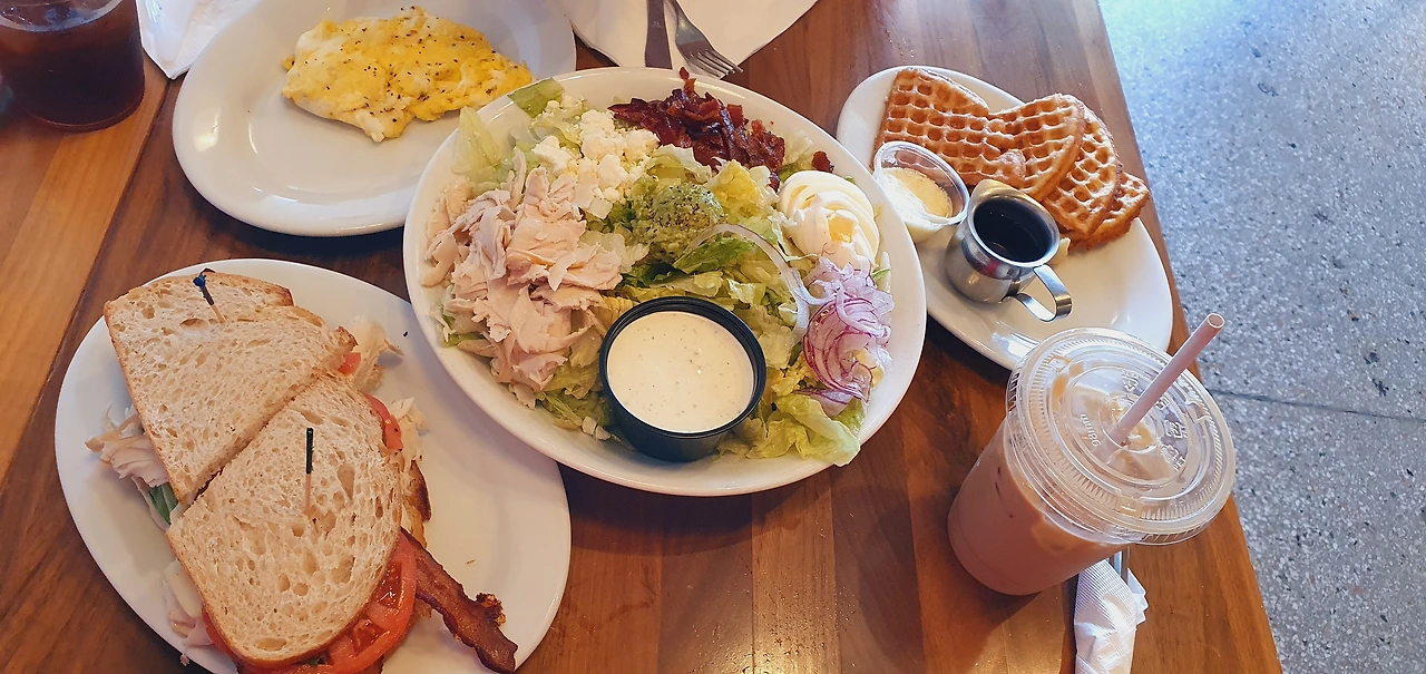 일요일 한 시쯤이었는데 사람이 정말 많았다. 다른 가게들은 비교적 한산하던데 이 카페는 사람이 꽤 많았다. 바깥이 잘 보이는 예쁜 자리를 잡았다. 집 밥을 기본으로 하다 보니 한 번씩 다운타운에 외식을 하러 나올 때, 마음이 너무 설렌다. 별것도 아닐지라도 말이다. 우리는 콥 샐러드와 와플, 터키 샌드위치, 스크램블 에그와 펌킨 크림치즈 머핀을 시켰다. 이상 7만 원짜리 브런치 되시겠습니다. 비싼 가격에 남편에게 타박을 먹었지만 조금도 후회하지 않았다. 남이 해주는 밥은 너무 맛있다. 이런 날도 있어야 또 힘을 내서 밥을 하지!