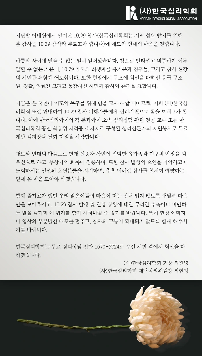 모두가 마음이 힘든 시기일 것이라 생각이 든다. 필자가 속한 한국상담심리학회에서 마음건강 유지를 위한 권고를 제작하여 배포하고 있다. 한 번씩 꼭 참고하여 함께 실천해 보면 좋겠다. 또, 주변에 직/간접적으로 사건을 경험하거나, 스트레스를 경험하고 있는 경우 아래 기관에서 무료로 심리 상담을 받을 수 있으니 널리 알려지기를 바라본다.