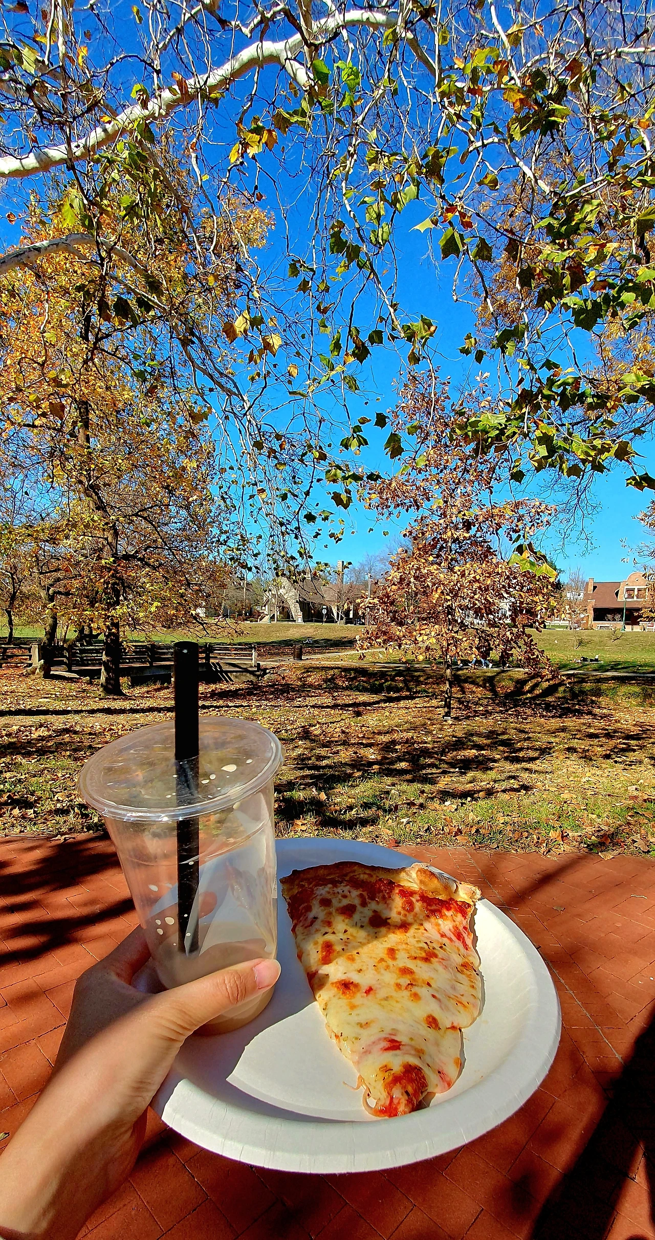 바로 옆에 학교 피자집이 있어 저렴한 가격에 치즈 피자 한 조각을 사와 볕에 앉아 먹었다. 오늘은 그런 날이었다. 굳-이, 구태-여 밖에 나와서 먹고 싶은 그런 날 말이다. 길 한복판에 벤치에 철퍼덕 앉아 고즈넉한 가을 풍경과 지나가는 사람들을 구경하며 느릿느릿 피자와 버블티를 먹었다. 참, 행복이 별건가? 싶었다. 미국에서는 길바닥에서 음식을 먹는 것도 자연스럽고, 남들이 뭘 하건 신경 쓰지 않아서 덩달아 자유로워지는 것 같다. 각자 원하는 대로 존재하며 이 계절을 즐기면 그만이다. 혼자서 그렇게 한참 풍경을 눈에 담고 돌아왔다.