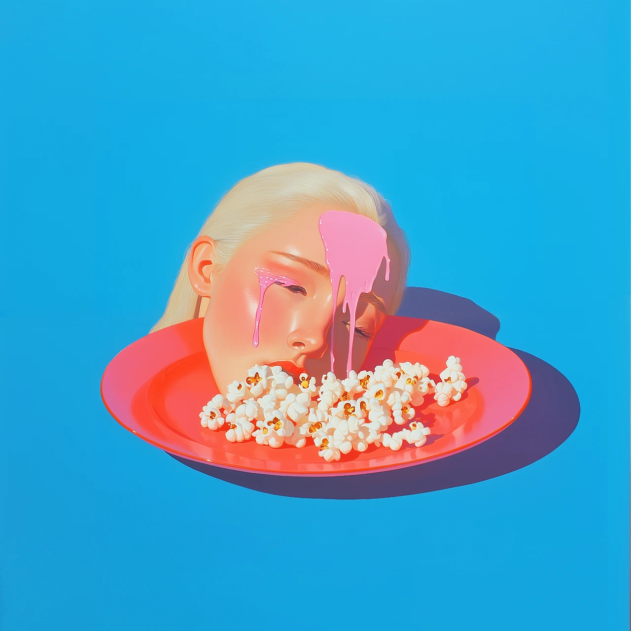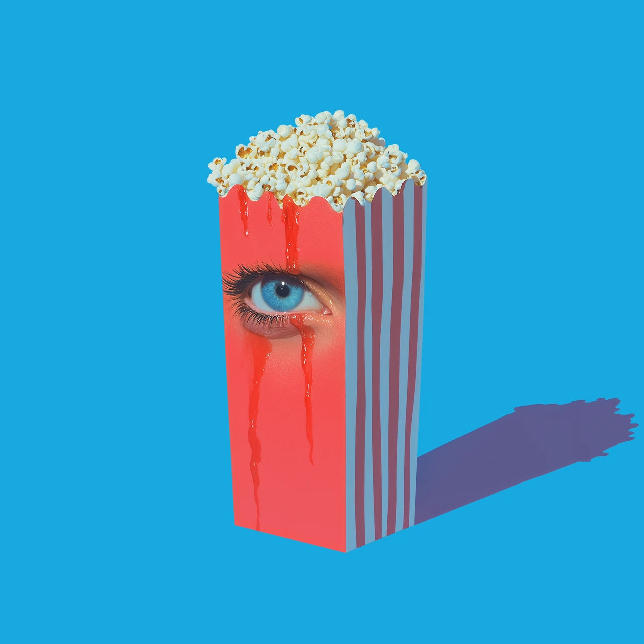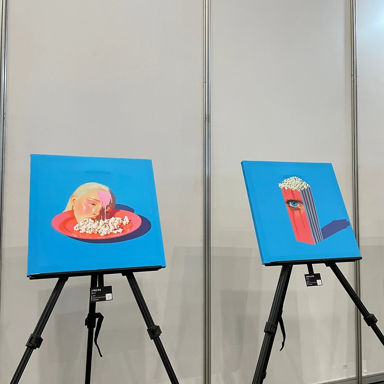 영화관에서 팝콘을 먹으며 스크린 속 비극을 구경하는 것처럼, 우리는 타인의 고통을 안전한 거리에서 관람한다. 그 무감각을 화려한 팝아트 색감으로 포장했다.
