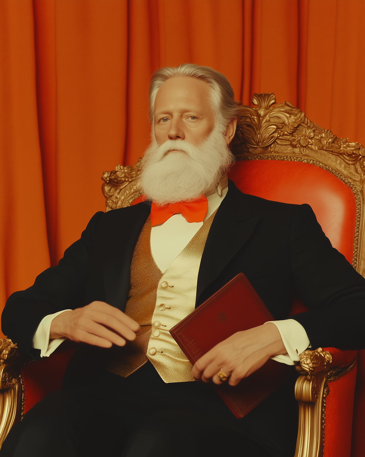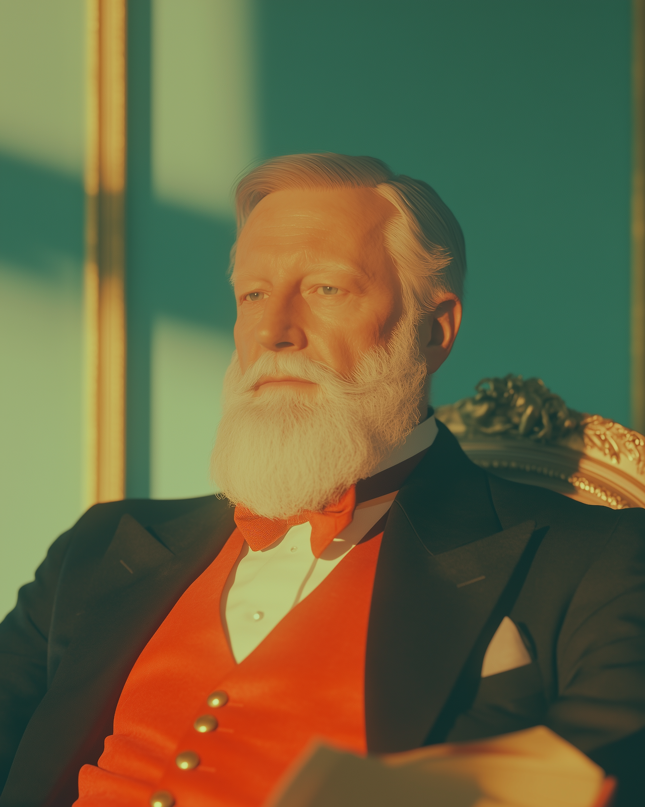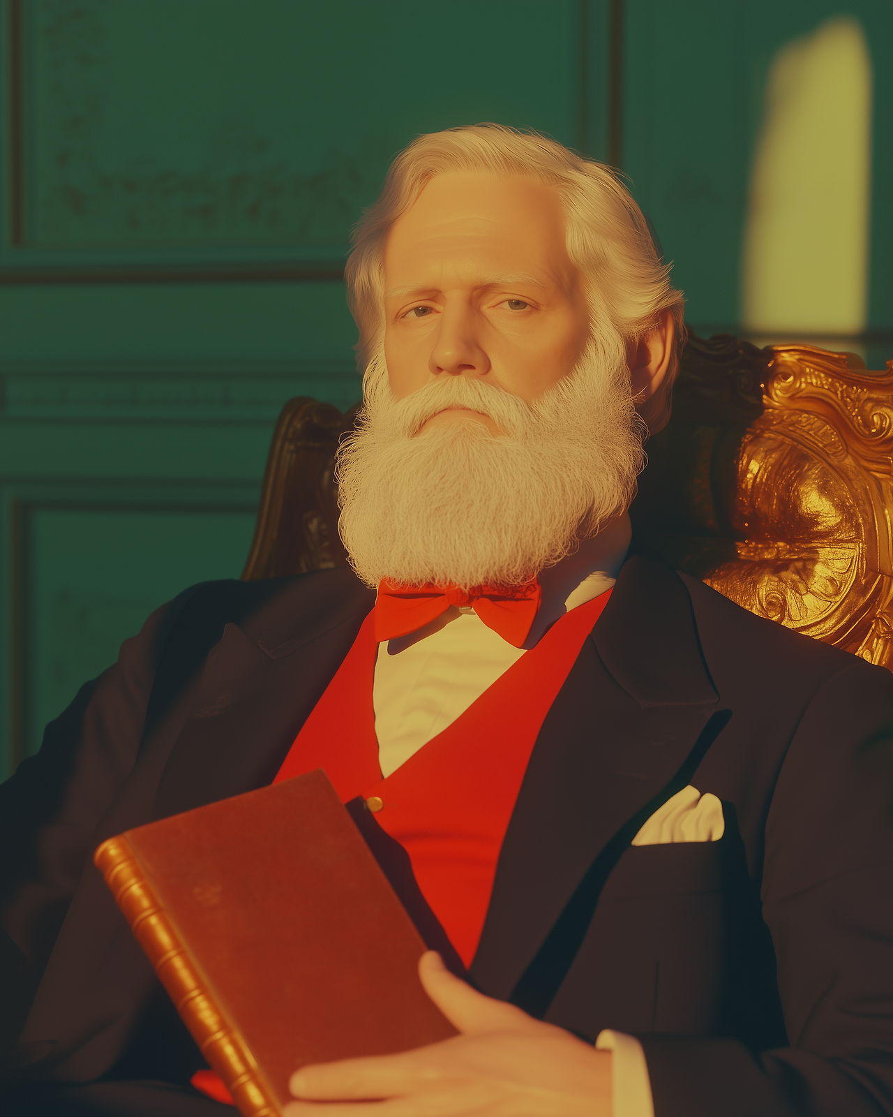 지혜와 품격이 넘치는 70대 후반의 노신사. 그의 긴 흰 수염과 깊은 주름은 오랜 세월 쌓아온 지혜를 말해주고, 날카롭지만 따뜻한 눈빛은 그의 통찰력과 인간미를 동시에 보여줍니다. 고급스러운 다크 네이비 수트와 금색 단추가 달린 베스트는 그의 품위를 한층 돋보이게 합니다. 붉은색 보타이는 전통과 혁신의 조화로운 만남을 상징합니다. 한 손에 든 오래된 가죽 표지의 책은 지혜를 나타냅니다. 그의 표정은 진지함 속에 깃든 미소로, 학문의 엄중함과 새로운 발견의 기쁨을 동시에 표현합니다. 전체적으로 따뜻한 황금빛 조명 아래 있는 듯한 이미지는 인류에 공헌한 지식과 업적의 영광을 상징합니다.
