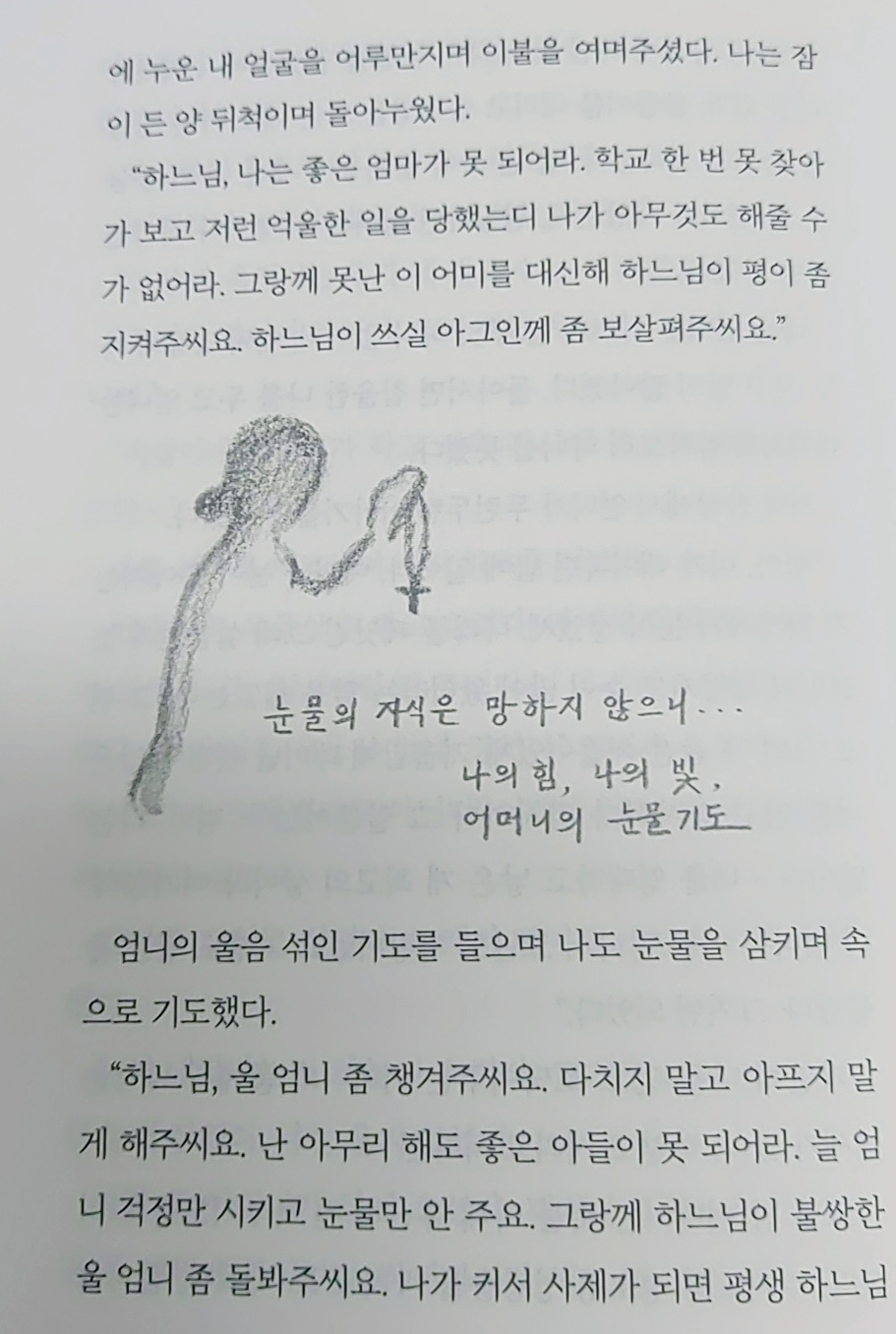 "울 엄니와 나는 '좋은 부모'도 '좋은 자식'도 아니었다. 그저 말없이 곁을 지키며 함께했고 서로를 향해 눈물의 기도를 바쳐줄 뿐이었다. 어머니가 내게 좋은 자식이 되어주기를 바라지 않았기에 나는 나 자신이 되고 나의 길을 찾아 나아갈 수 있었다."