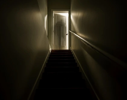 K는 허둥대며 계단을 내려가기 시작한다. 이상하게 계단은 나가는 문으로 곧장 연결되어 있지 않다. 복도를 계속해서 헤매고 다닌다. 꽉 닫힌 문, 문, 문들만 즐비하게 늘어서 있을 뿐 출구는 어디에도 보이지 않는다. K는 악몽에서와 똑같이 건물 안 미로에 갇혀버렸다.