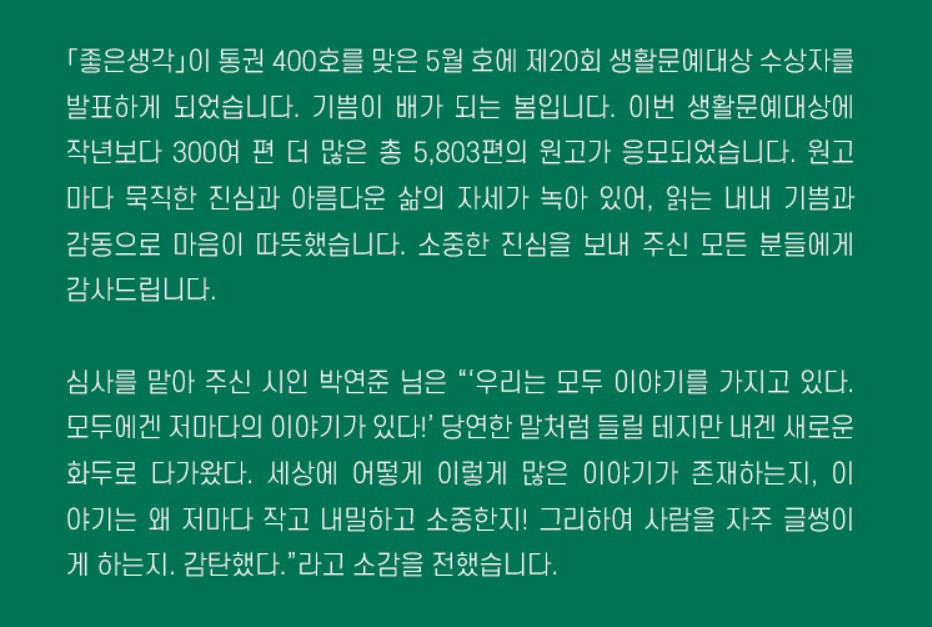 제가 두 해에 걸쳐 응모하고 수상해 본 결과, 좋은생각은 사연 자체에 집중한다는 느낌이 강했습니다.