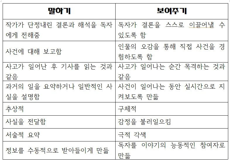 그럼 '말하기'와 '보여주기'의 차이점 먼저 간단히 짚어보도록 하겠습니다.