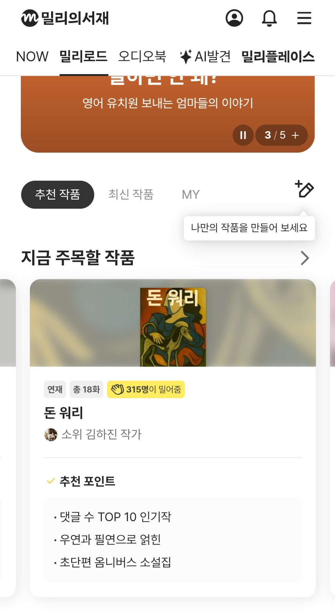* 밀리의 서재에서 3관왕(이 달의 밀크 우수작품 선정, 분기별 우수작품 선정, 2025 밀리로드 Top 50위 진입)을 한 초단편소설집 '돈 워리'가 좋은 소식을 가져왔습니다. 댓글수 Top 10의 인기작이자 '지금 주목할 작품'에 선정되었습니다. 소설 쓰기에 관심 있는 분들의 많은 응원과 밀어주리! 부탁드립니다.