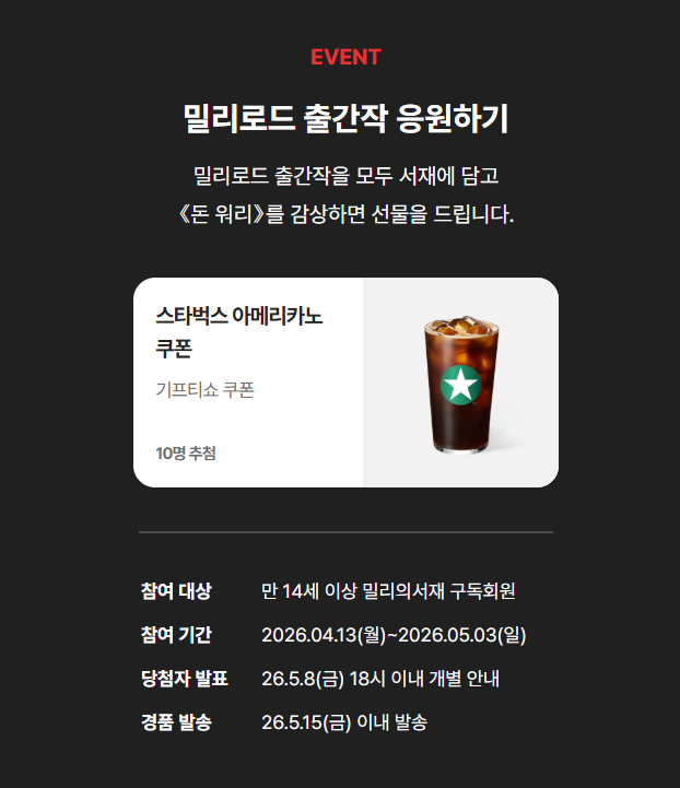밀리의 서재에서 이벤트를 하고 있습니다. '내 서재에 담기'하시고 읽어 주시면 당첨을 통해 10명의 독자분들께 커피 쿠폰을 드린다고 하네요. 밀리의 서재 편집자님께서 초반 평점과 리뷰가 중요하다고 귀띔을 해 주셨습니다. 부끄럽지만 회원이신 분들이 계시다면 평점과 리뷰 부탁드립니다. 책 증정 이벤트를 하고 싶어도 전자책이라 그럴 수 없음이 무척 안타깝습니다. 그 이벤트는 종이책 출간 이후로 잠시 보류하겠습니다. (꼭 종이책이 되기를 빕니다. 전자책이 잘 되어야 종이책이 나오겠죠? ㅜㅜ)