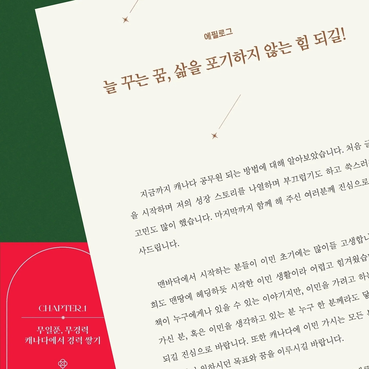 이제 한국에 온 지 1년 8개월이 넘었다. 처음 캐나다에 이민 갔던 시절이 자주 떠오른다. 캐나다에서 직장을 구하기 위해 힘쓰던 시간들, 아이들을 어떻게 키워야 되는지 고민했던 시절, 가정은 어떻게 챙기나 등의 시간이 주마등처럼 지나갔다. 그때를 돌아보며 나를 정리할 수 있는 기회를 가졌다. 다행히 3년을 계획했지만 그보다 훨씬 앞당겨 하고 싶은 일이 무엇인지 찾았다. 여기에는 또 한번의 터닝 포인트가 있었다. 바로 책을 집필한 일이었다. 책을 한권 출간하고 내가 뭘 좋아하는지 알게 되었다. 책을 통해 나 자신을 많이 돌아볼 수 있는 계기가 되었기 때문이다.