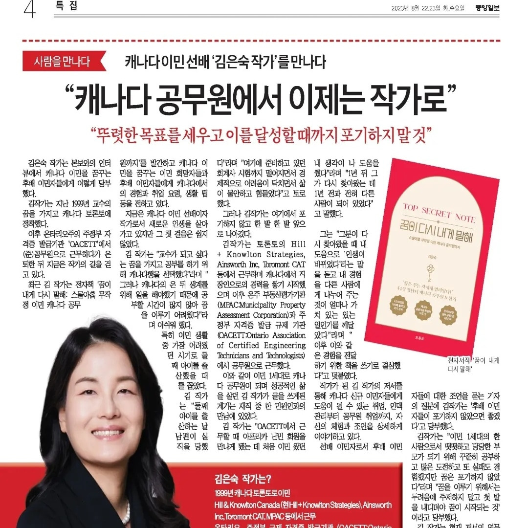 캐나다 살이를 하며 직장을 잡기 위해 고군분투했던 과정을 가감 없이 써 내려간 여정이었다. 내 첫책 "꿈이 내게 다시 말해: 스물아홉 무작정 이민 캐나다 공무원까지"를 소개한다. 경력 없이 캐나다에서 첫 직장을 잡은 비결부터, 공기관/공기업 취업의 비결을 모두 담았다. 캐나다에서의 구직, 면접준비, 컬리지 신청, 발런티어잡 노하우, 공기관/공기업 취업 비결, 업무에서 활용 가능한 스킬 등 총정리하였다. 29살에 단 돈 2,000만 원을 들고 이민을 떠난 후 일어난 좌충우돌 스토리와 이민 1세대로 캐나다 온타리오주 정부 규제기관 공무원으로 근무한 경험을 토대로 쓴 자기 계발서다.