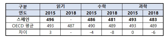 우수한 인재는 경제성장의 원동력이다. 우리가 반세기 남짓한 시간에 이뤄낸 한강의 기적도 뜨거운 교육열이 있었기에 가능했다. 교육은 현재의 삶뿐만 아니라 미래의 삶을 결정짓는 핵심 요소이다. 스페인은 교육 분야에서도 40개국 중 31위로 좋지 않은 모습을 보였다. 25~64세 인구 중 고등교육 이상을 받은 인구 비중은 59%로 OECD 평균(78%)과 큰 격차를 보였다. 경제활동인구의 교육수준이 낮으면 취업경쟁력과 생산성도 낮을 가능성이 크다. OECD는 3년 단위로 국제학업성취도평가(PISA)를 실시하여 15세 학생들의 수학,읽기,과학 등의 수학능력을 국가별로 비교하고 있다. 2015년, 2018년 평가 결과 스페인 학생들의 수학, 과학 수학능력은 OECD 평균보다 낮았다.