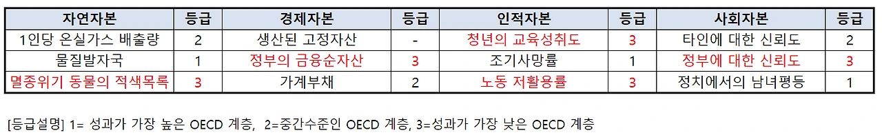 OECD '삶의 질 보고서(How's life?)'는 현재 삶의 질뿐만 아니라 미래에 나은 삶을 위한 국가의 자원 상태도 발표하고 있다. 2020년 보고서는 자연자본, 경제자본, 인적자본, 사회자본으로 나눠 분석하였는데 취약한 정부 재정상태, 청년들의 낮은 교육성취도, 정부에 저신뢰 등이 미래의 삶의 질을 위협하는 주요 리스크 요인으로 분류되었다.