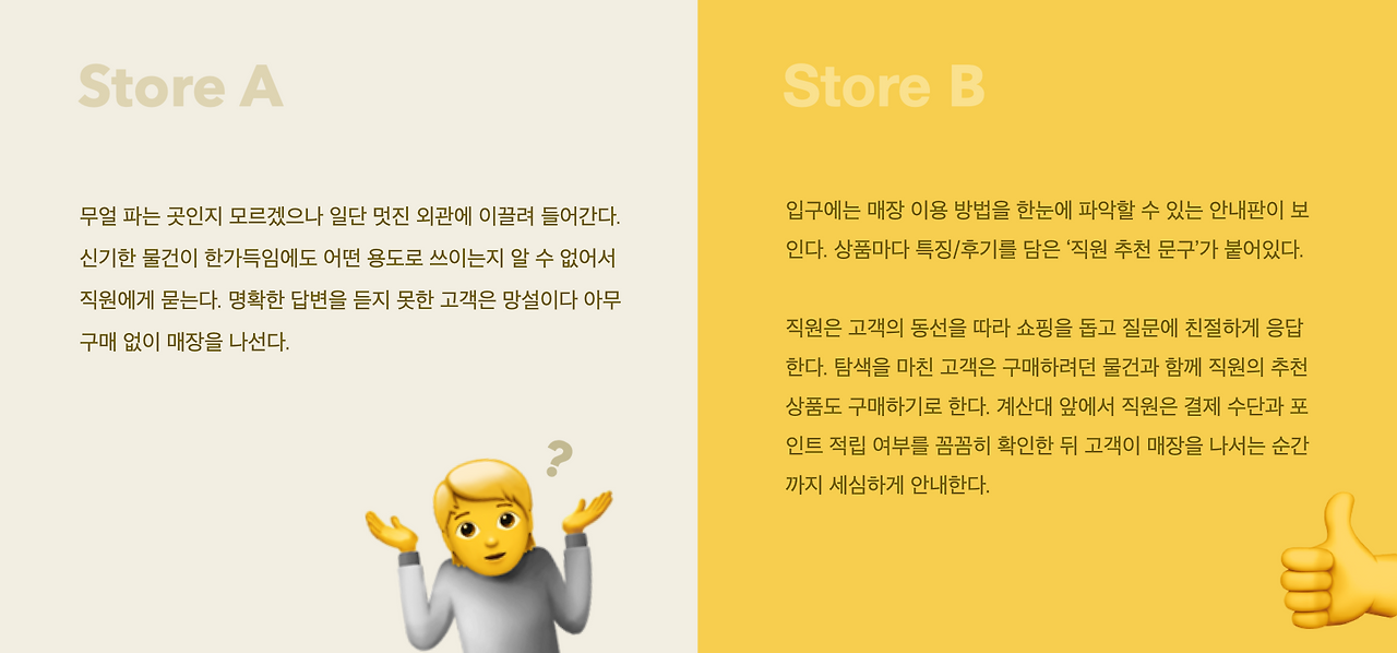 가상의 두 매장에서 긍정적인 경험을 제공하는 쪽은 단연 B 매장이다. 쉽고 명확한 설명, 친절한 응대로 고객이 불편함 없이 쇼핑을 즐기며 예정에 없던 추천 상품까지 구매했으니 말이다. 이처럼 만족스러운 서비스 경험은 브랜드 이미지로 직결될뿐더러 비즈니스 목표에도 기여할 수 있다.