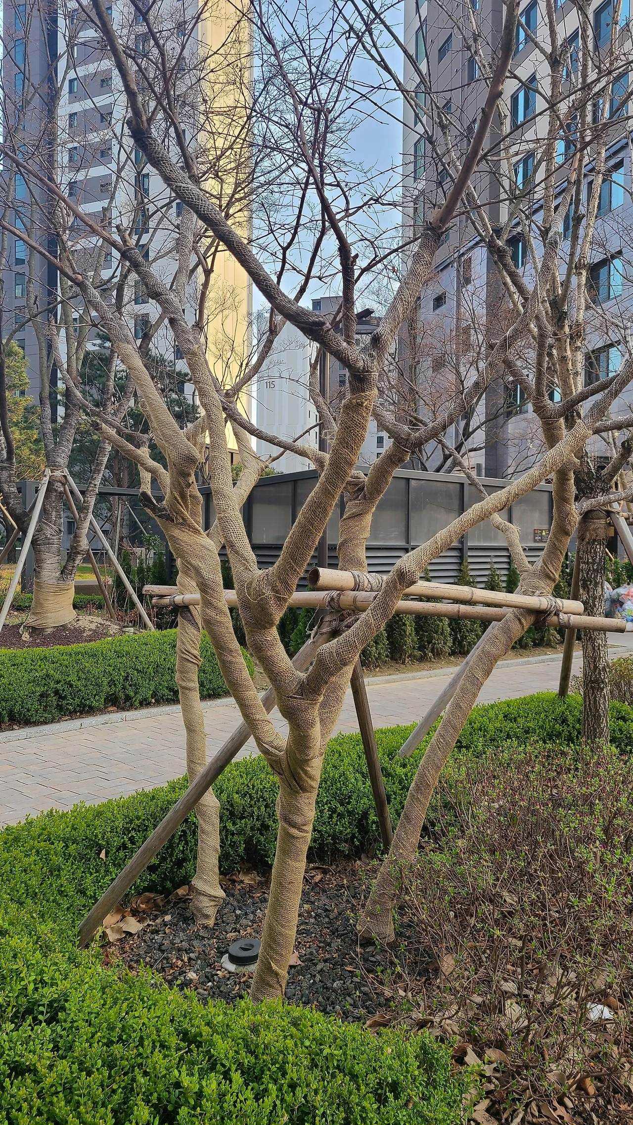 아, 드디어 의문이 풀리는 순간! 그럼 나무의 크기나 나이보다는 나무의 종류에 따라 추위에 약한 나무에게 옷을 입혀준다는 설명이 더 맞겠구나.