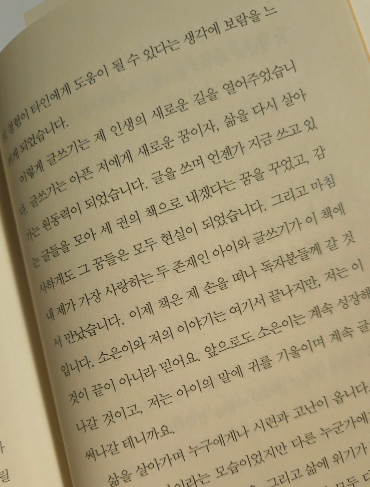 글쓰기는 아픈 저에게 새로운 꿈이자, 삶을 살아가는 원동력이 되었습니다. 글을 쓰며 언젠가 지금 쓰고 있는 글들을 모아 세 권의 책으로 내겠다는 꿈을 꾸었고, 감사하게도 그 꿈들은 모두 현실이 되었습니다. 그리고 마침내 제가 가장 사랑하는 두 존재인 아이와 글쓰기가 이 책에서 만났습니다. 이제 책은 제 손을 떠나 독자분들께 갈 것입니다. 소은이와 저의 이야기는 여기서 끝나지만, 저는 이것이 끝이 아니라고 믿어요. 앞으로도 아이는 계속 성장해 나갈 것이고, 저는 아이의 말에 귀를 기울이고 계속 글을 써나갈 테니까요.