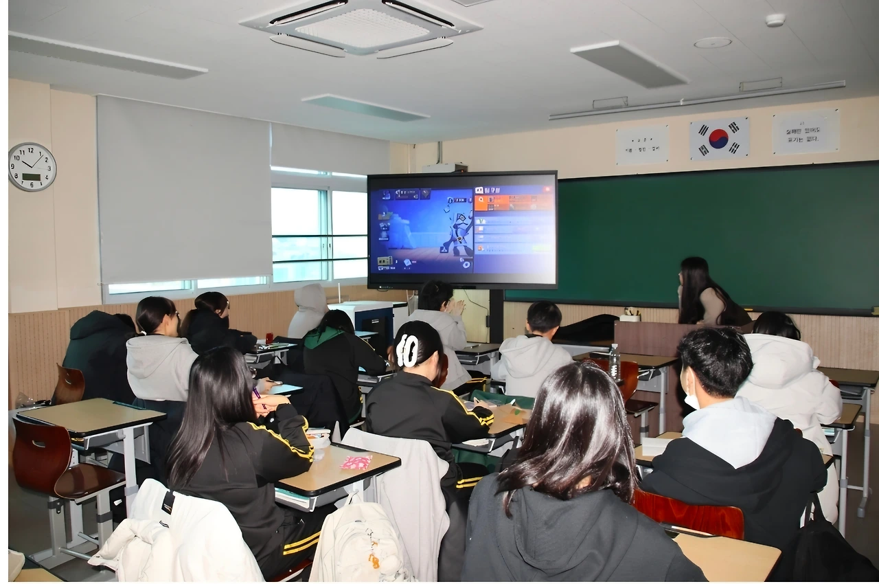 교실에서 전자 칠판을 통해 생중계되는 e 스포츠 대회