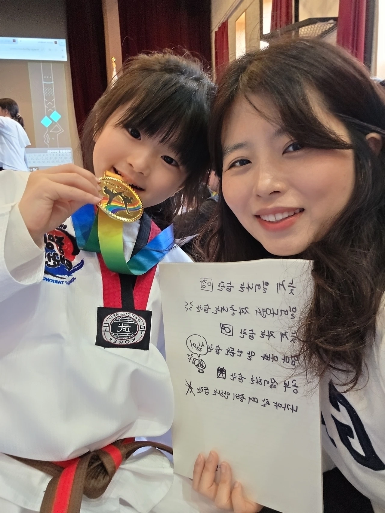 아이들이 각자 고치고 싶은 나쁜 습관을 송판에 적고, 발차기로 격파한 뒤 부모가 메달을 걸어 주는 시간이었다. 아빠가 송판을 들고 있었는데, 소은이가 발차기를 하기 전 송판 방향을 바꾸었다.