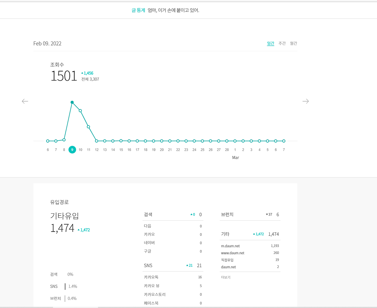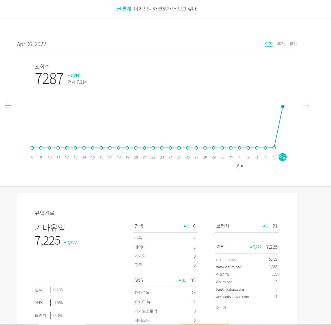 다음 메인 노출의 힘도 대단했다. 순식간에 조회수를 1000 단위씩 갱신했고, 자정 무렵에는 마침내 조회수 7000을 돌파했다. 6개월 전 내가 브런치에 쓴 첫 글 '유방암 진단을 받다.'의 조회수를 하루 만에 뛰어넘는 숫자였다.