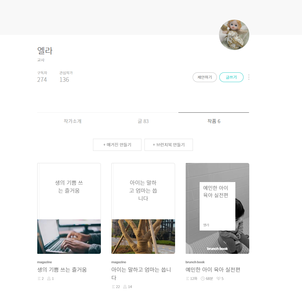 작품을 누르면 작가의 매거진과 브런치북별로 글을 볼 수 있다.