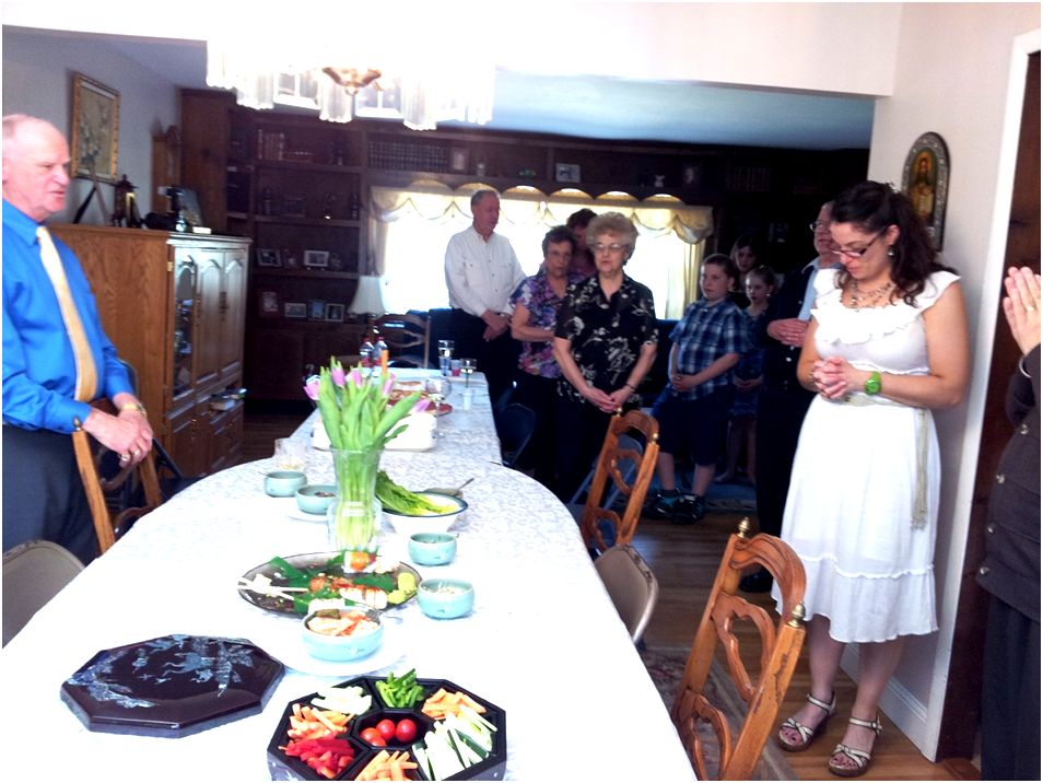 내가 가져간 꽃을 너무 고마워하며 바로 꽃병에 꽂아서 테이블에 놓는 것을 보며 기분이 좋았다. . 이 가족은 모두 카톨릭이라 Jeani 아빠가 대표기도를 하고 함께 기도 후 먹고싶은 것을 접시에 덜어 먹었는데 구절판도 보이고 한쪽에 음식을 출장 뷔페처럼 세팅했는데 잡채와 김밥도 있었다. 지니가 아이들 입양후 한국문화에 워낙 관심이 많고 음식 하는 것을 좋아해서 한국요리도 자주했다고 한다... 뉴저지의 집답게 뒷마당이 넓어 아이들은 먹고 바로 뒷마당에 가서 노는데 이날 울 현이 첨으로 두발자전거 타기 성공한 날이었다.