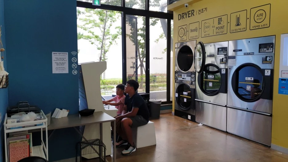 "2km 정도 거리에 빨래방이 있는 거 같아. 내가 먼저 가서 빨래 돌려놓고 연락할게. 근처에서 아침을 먹으면 될 거 같아. 빨래 시작하고 식당 찾으면 전화할게. 애들이랑 기다리고 있다 전화하면 나와."