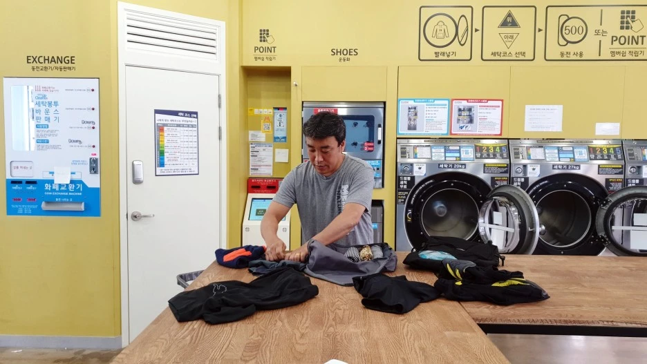 검색을 마친 남편은 빨랫감을 챙겨 자전거 가방에 넣고 나섰다.
