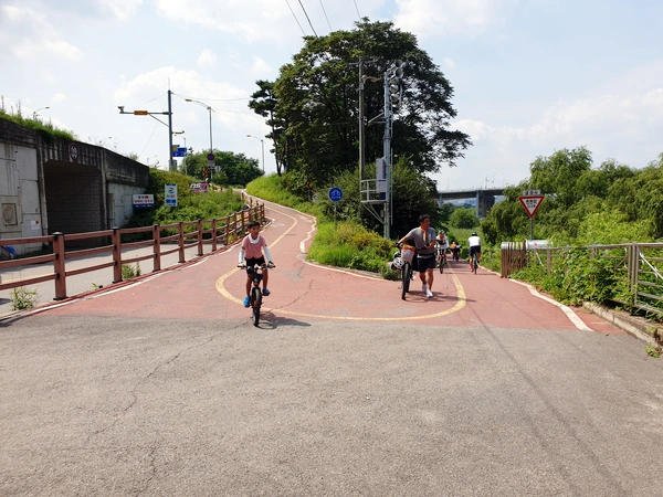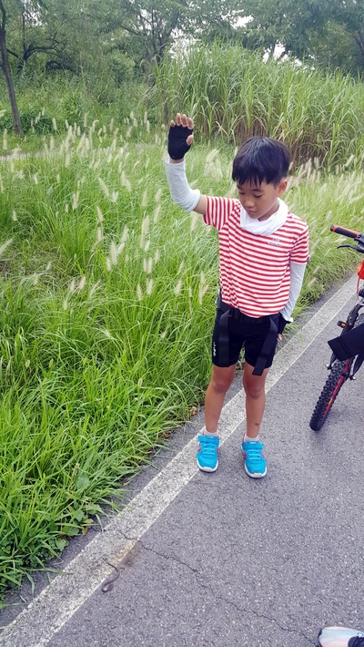 어제 숙소를 찾기위해 자전거도로에서 한참 벗어났다. 네비도 없이 밤에 지났던 곳에서 길을 찾으 려니 어느 쪽으로 가야 할지 헷갈렸다. 몇 분을 헤매다 자전거 길로 접어들었다. 자전거 길로 들어가 처음으로 만난 건 초록 자연이었다. 양 옆에 줄지어 있는 풀과 나무를 만나니 몸은 덥지만 눈은 시원시원하다. 그다음 우리를 반겨준 건 다름 아닌 뱀이었다. 앞서가던 아이들은 뒤에 따라가는 나에게 "뱀이에요!"라고 소리를 지르다가 이내 조용해졌다. 뱀이 놀라서 돌발 행동을 할지도 모르다는 판단 때문이었단다. 우리는 자전거를 세우고 뱀 사진을 찍었다. 어제 아라 한갈종주길에서는 메뚜기들이 남편의 가방에 붙은 채 한참 동안 이동하는 모습을 보고 신기해했다. 오늘은 뱀이라니! 아이들은 자연산 뱀을 보며 신기해했다. 독사일까 아닐까 궁금해하기도 했다. 얼굴이 세모 모양이면 독사라고 하는데 약간 세모인 것 같기도 하고... 겁 없이 넘 가까이서 보는 건 아닌가 아이들 걱정을 하며 난 멀찌감치 떨어져서 신기해 했다.