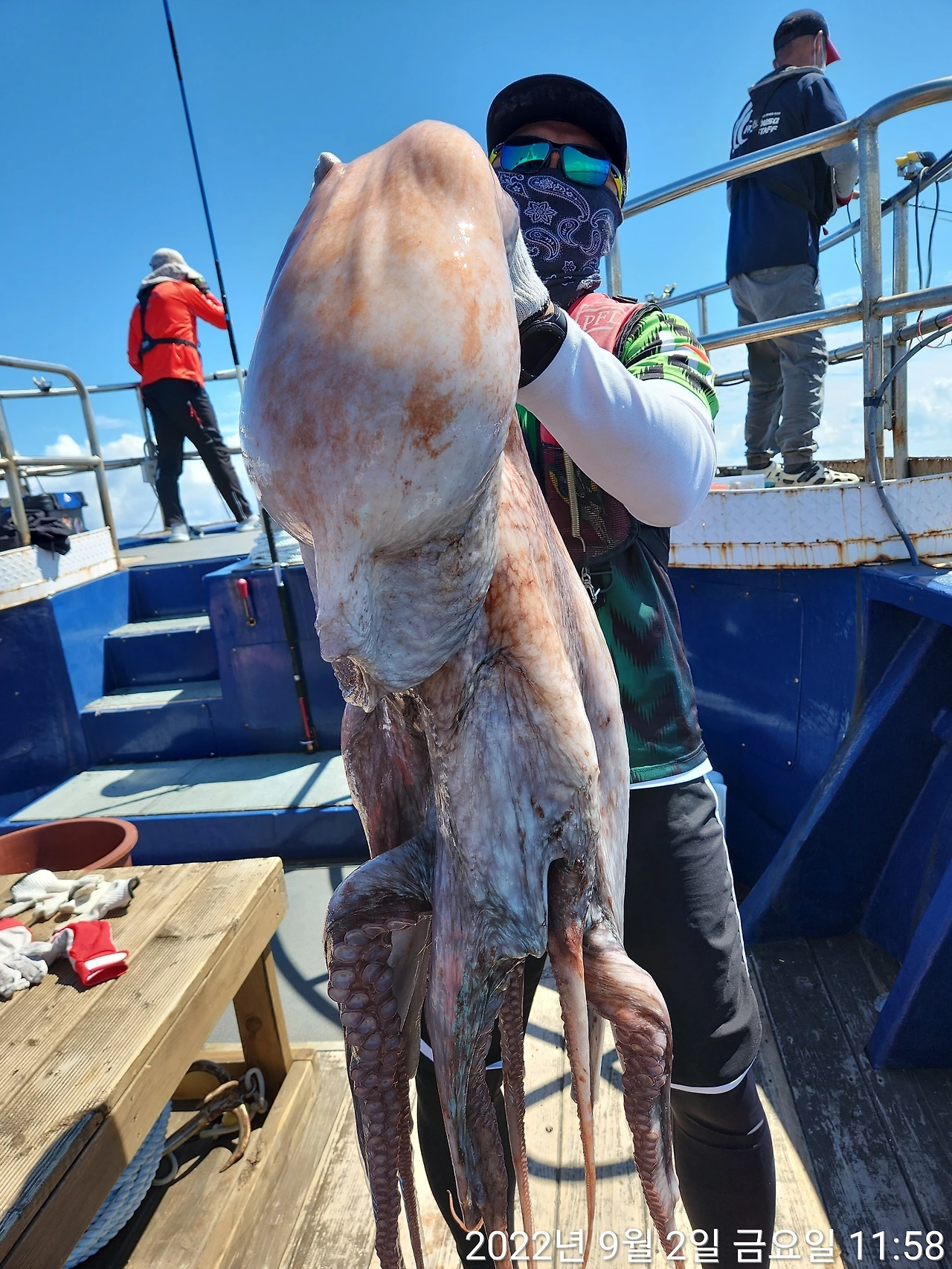 잡고보니 대왕문어가 15킬로가 넘었다 . 배에서 제일 일 큰것을 잡았다 사실 그런 것은 나에게 중요치 않았다. 중요한 것은 내가 대왕문어를 잡았다는 것이다.
