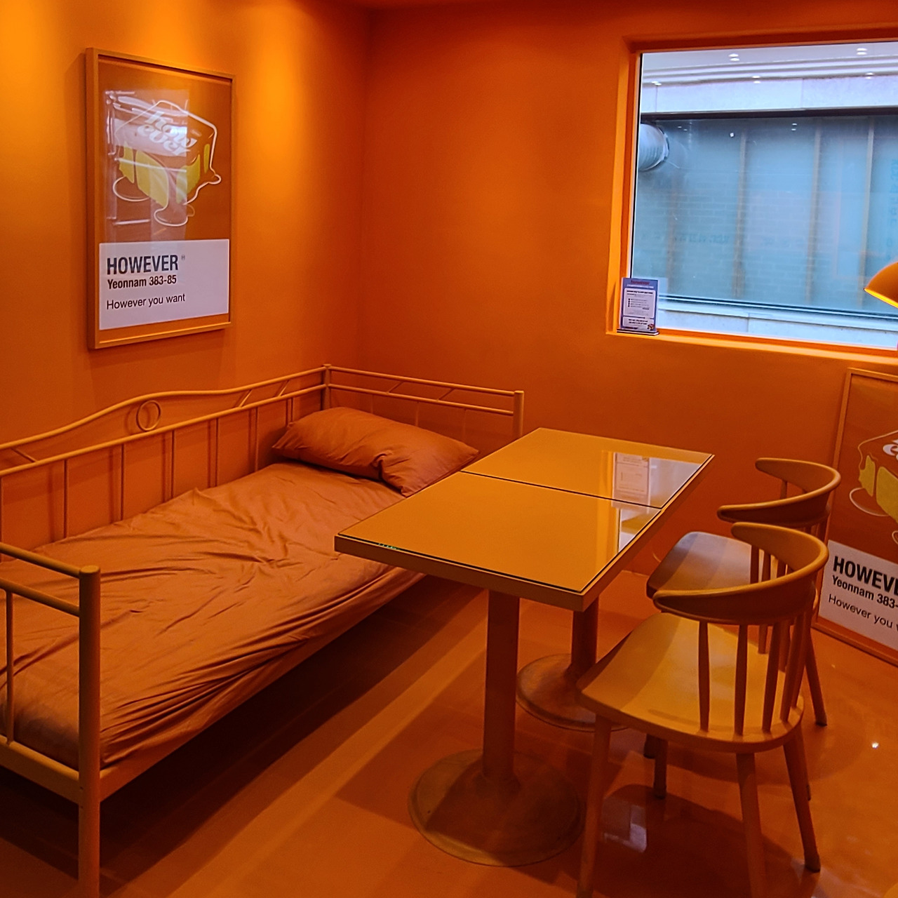삼화페인트이기에 가능한 컬러 브랜딩이 엿보인다. 페인트 회사라는 정체성 그 자체를 풀어냈다. 최근 로컬 공간 내 트렌드인 주택을 개조한 공간, 어쩌면 흔한 카스테라와 커피라는 콘텐츠가 '비비드한 대조 색상'과 만나면서 한 끗 차이를 만들어냈다.