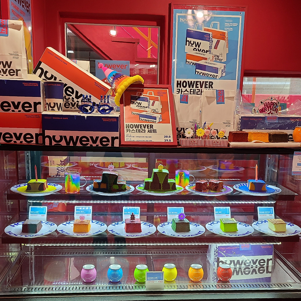 보통의 감성 카페가 지향하는 부드러운 톤을 사용하지 않고 완벽한 원색을 선택했다. 메뉴인 카스테라에도 우유 크림과의 보색 대비를 활용하여 시각적 즐거움을 선사한다. 색상으로 만든 다양한 조합 선택지가 고객을 이끌 흥미요소로 작용하기도 한다. 시그니처 메뉴인 레인 보우 샤워 크림은 인스타그래머의 SNS 유행을 이끌어내기에 충분하다.