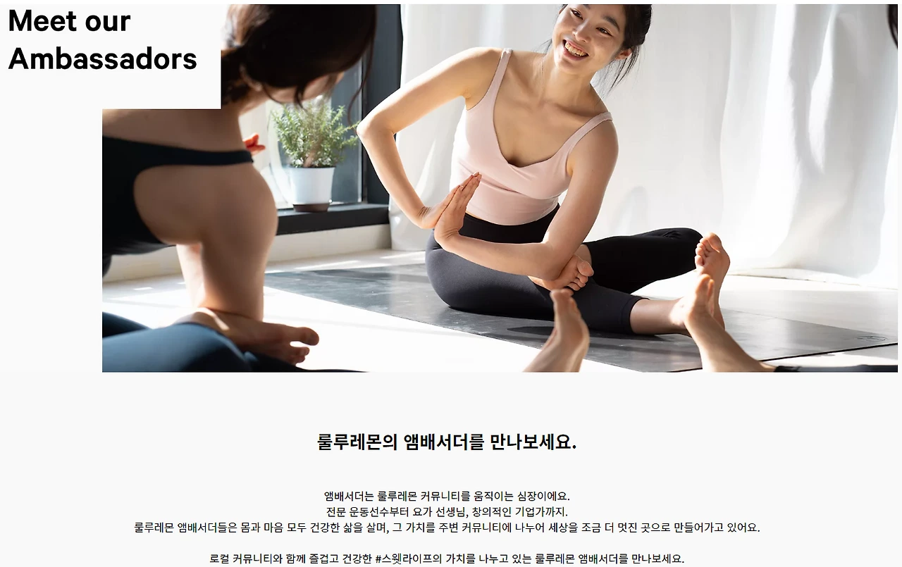 룰루레몬은 유명 모델을 쓰지 않는다. 대신 룰루레몬 앰배서더로 선정된 요가와 피트니스 종사자들이 #스웻라이프를 전파하고 있다. 기존의 마케팅 공식을 따라가지 않고 요가 커뮤니티를 만들어 그들이 제품을 체험할 수 있도록 하는 것에 집중했다.
