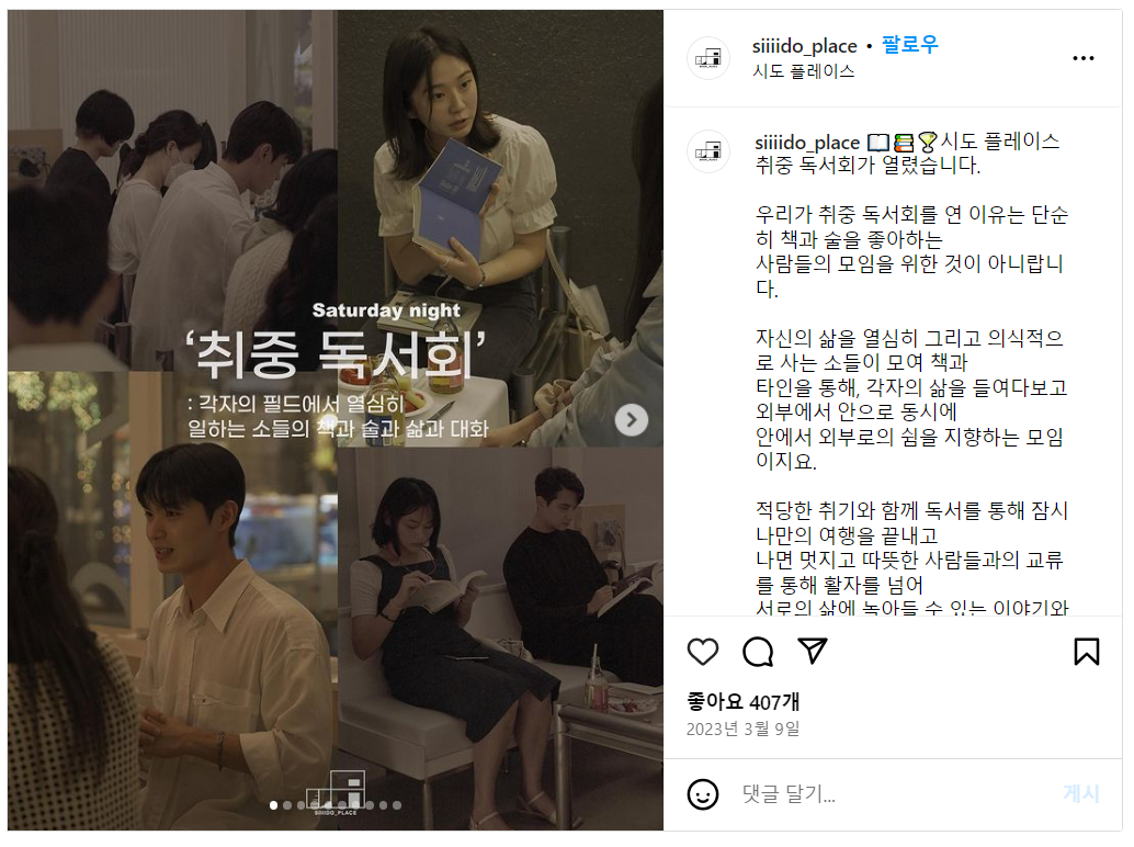 커뮤니티 모임을 운영하는 '시도플레이스'에서는 '취중독서회'를 지속적으로 오픈하는데요. 자신의 삶을 열심히 그리고 의식적으로 사는 사람들이 모여 책과 타인을 통해, 각자의 삶을 들여다보고 외부에서 안으로 동시에 안에서 외부로의 쉼을 지향합니다.