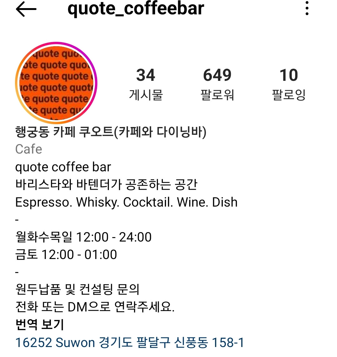 바리스타와 바텐더가 공존하며 위로를 건네는 카페 겸 바 '쿠오트'는 고급스러운 호텔 바와 같은 분위기를 풍긴다. 커피 뿐만 아니라 위스키와 칵테일, 와인까지 부담없이 다채롭게 즐길 수 있다.