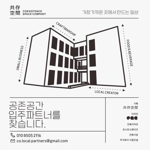 공존공간은 카페, 게스트하우스, 공유오피스, 로컬브랜드가 모여있는 행궁동의 로컬크리에이터 집합소이다. 로컬 스쿨의 역할을 하며 로컬브랜드 간의 커뮤니티이자 브랜드가 팬을 만나는 연결점을 제공한다.