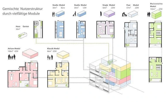 구조 변경이 가능한 평면 모델 또는 다양한 가구 형태가 융합된 선택적 평면 모델 등을 적용할 수 있다. 예를 들어, A동 101호에 거주하는 신혼부부 2인 가구가 아이를 갖고 3인 가구가 되었을 때, 하나의 방에 거실을 가진 기존 공간을 분리하여 2개의 방으로 구조를 변화시킨다.