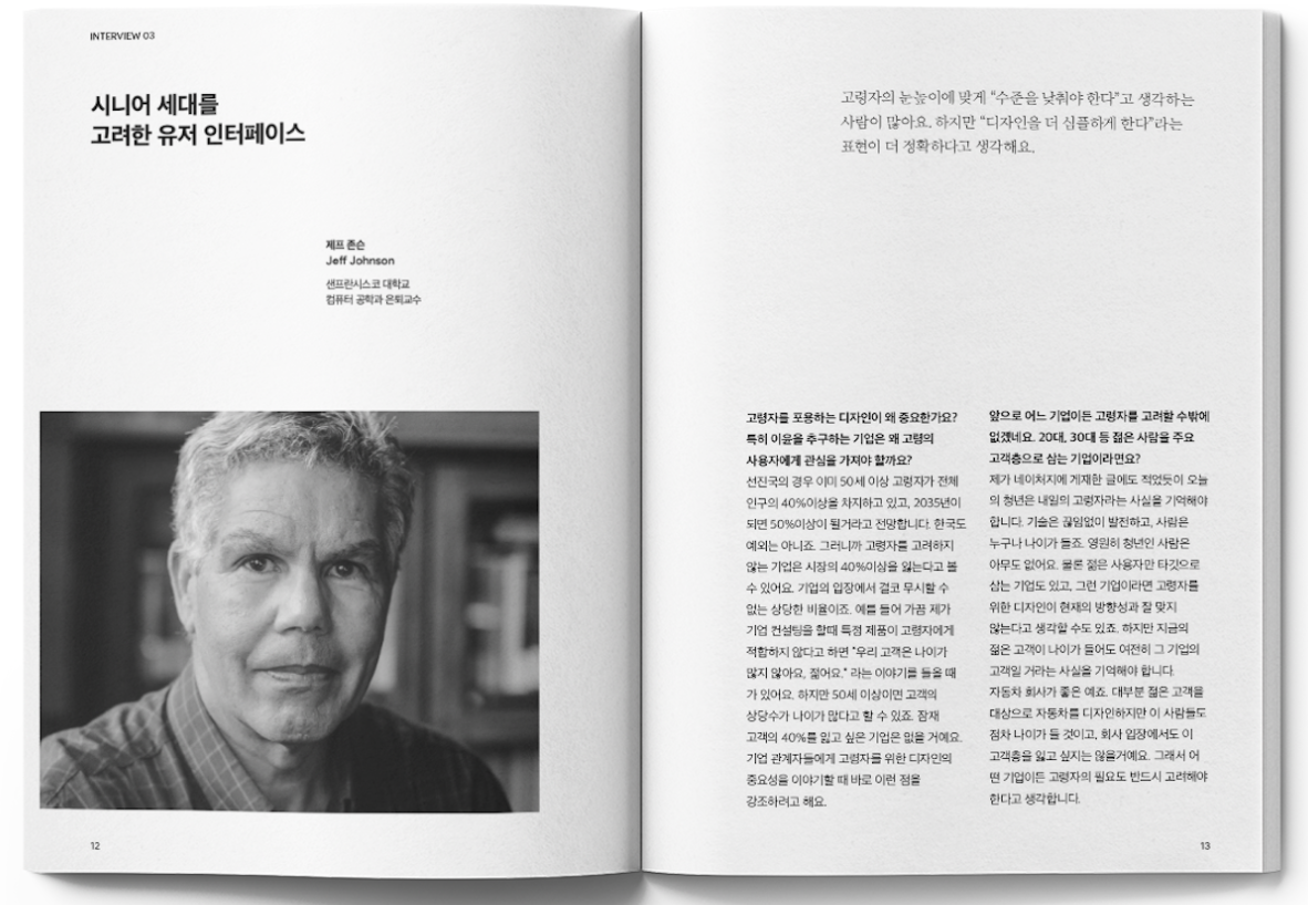 시니어 세대를 위한 디자인을 위해 가장 중요한 것은 'CO-DESIGN'이다. 타깃 고객뿐만 아니라 모든 이해관계자가 디자인에 참여해야 한다. 무심코 연령을 필터로 사용하기 시작할 때 위험신호가 켜진다.