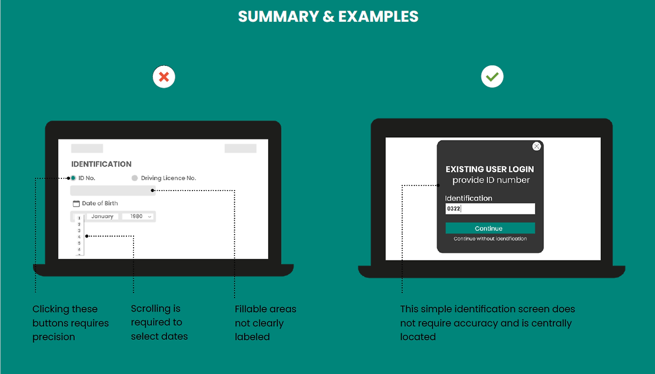 -터치 스크린의 경우 : 가능한 한 긴 스트로크와 드래그 제스처를 피하고 스크롤 옵션을 줄인다. 특정 위치를 가리키는 화살표나 버튼과 같은 대안을 제공한다. 정밀한 동작 대신 편안한 탭핑/클릭을 위해 최소 44x44픽셀의 최소 크기를 유지한다. 펼치기, 집기, 회전과 같이 미세한 모터 조절이 필요한 동작은 제외한다.