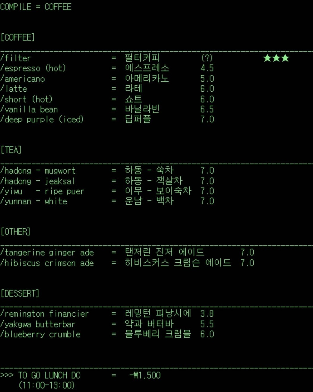 카페 '콤파일'은 어디에서나 흔히 즐기는 음료가 아닌 한 모금, 한 모금 여유와 휴식을 가지며 마시는 순간을 담아낸다. 흘러나오는 느린 음악, 컨베이어가 전달하는 커피, 추억의 MS-DOS를 연상시키는 메뉴 화면. 모두 붐비지 않는 공간에서 일상으로의 회복을 이끌 원동력의 매개체가 된다. 메뉴를 비롯한 모든 정보들이 코드 형식으로 적혀있는 점이 추억을 떠올리게 만들어 참으로 매력적이다.