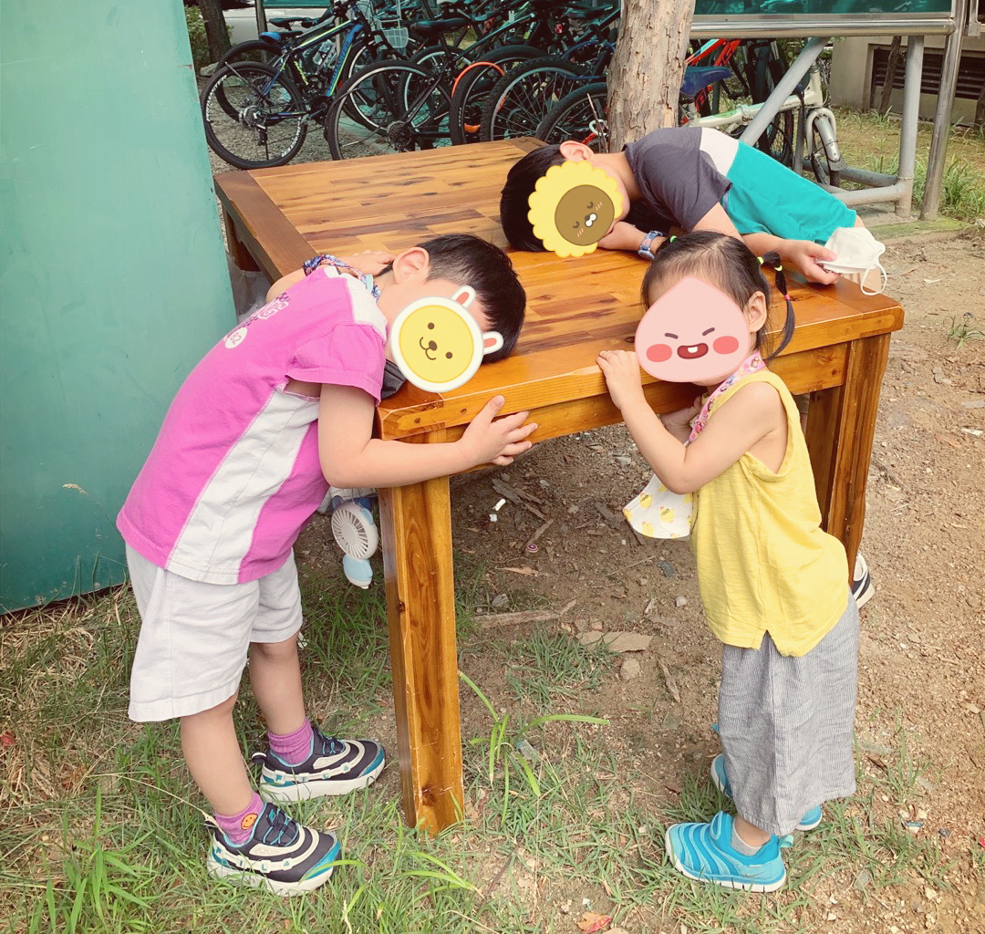 그런데 아이들에게도 그동안 그 식탁과 함께한 시간이 어떤 의미로 남아있었나 보다. 심지어 둘째는 눈물이 그렁거리는 눈으로 인사를 못했다며 터져 나오려는 울음을 참고 있었다. 그렇게까지 슬퍼할 것을 예상하지 못한 나는 아이들에게 미리 알려주지 못한 것이 미안했다. 어쩔 수 없이 폐기물 스티커를 붙여서 아파트 앞에 내다 놓은 식탁에게 가서 아이 셋이 인사를 하고 함께 사진을 찍는 것으로 이별 의식 같은 과정을 거쳤다. 아이들은 그 식탁에게 뽀뽀를 해주고 안아주며 말했다. "그동안 고마웠어. 새 주인 만나서 잘 지내~"