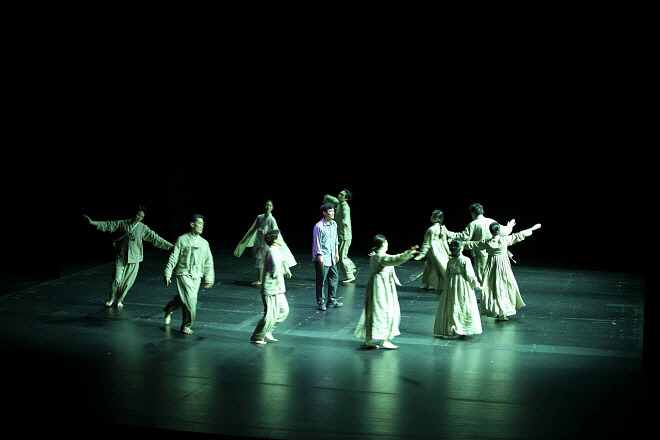 하지만 '새'와 '섬'은 어울리지 않는 단어이다. 새는 자유롭게 날아가야 하지만, 섬은 육지에서 고립되어 누구와도 자유롭게 닿을 수 없다. 작품은 세월호 참사의 희생자인 오루의 딸 도손에게 새의 모습을 투영하며 비극적인 역사와 희생자들에 대한 생각을 추방하는 것이 얼마나 이치에 맞지 않는 일인지를 이야기한다. 어린 새가 나는 법을 연습하는 과정은 오루가 자신의 역사를 하나하나 마주하는 과정이다. 오루의 과거 환상이 시작되며 무대 뒤 벽은 닫히고, 암전과 함께 무대 조명이 들어온다. 관객의 환상도 같이 시작되는 셈이다. 오루가 새를 따라 과거의 환영으로 들어가듯, 관객도 오루를 따라가며 연극적 환상으로 들어간다. 여전히 치유되지 못한 아픔을 가지고 비틀거리며 부모의 죽음부터 딸의 죽음까지를 마주해 나가는 오루는 관객을 이끄는 또다른 불안정하고 어린 새이다. 오루와 관객들은 오루의 기억 속 묻혀 있던 사건 하나하나를 생생하게 지켜본다. 그리고 매 사건의 끝에는 죽은 사람도, 산 사람도, 서로 대립하고 미워하던 사람들도 함께 손을 잡고 제의를 하듯 춤을 춘다. 오루가 힘겹게 딸의 죽음까지 마주하고 받아들인 이후에, 오루의 기억속 사람들은 다같이 새가 날아가는 몸짓을 하며 오루를 에워싸다 퇴장한다. 마주함을 통해 아픔과 희생의 역사를 하나하나 애도하며 새섬에 묶인 새가 날아가도록 비행을 완성시켜나가는 것이다.