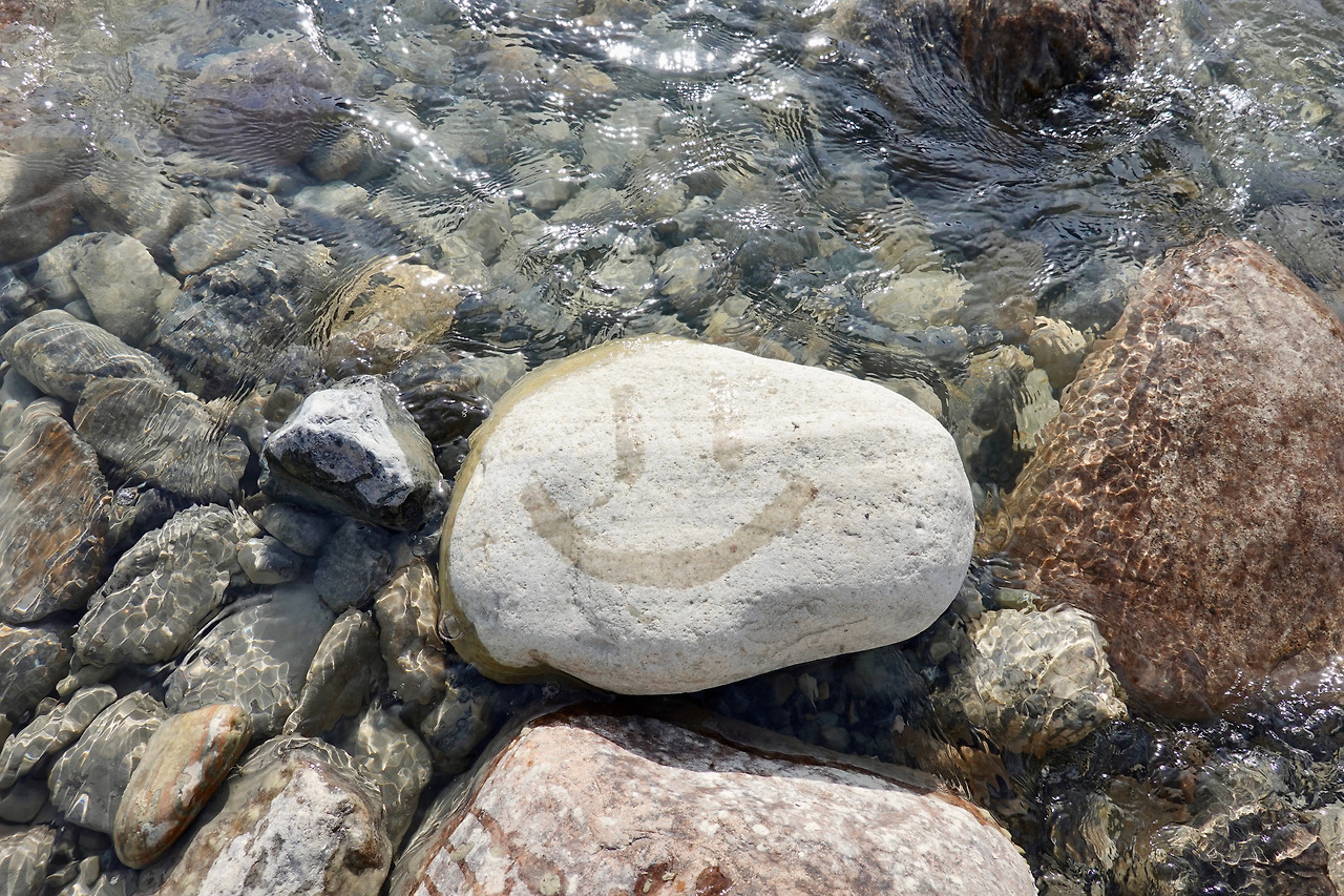 빙하가 녹아 에메랄드 빛을 내는 호수에서 기지개를 켜고 잠시 쉬는 동안, 누군가 보면 기분이 더 좋아지기를 바라며 동그랗고 마른 돌에 미소를 그렸다.