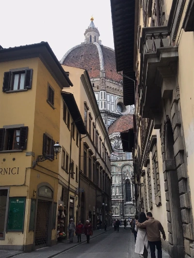피렌체에 머무는 내내 이 동네 골목은 다 걸어보겠다는 듯이 돌아다녔다. 도시의 상징인 두오모를 중심으로 한 번화가에서 벗어나 인적이 드문 공간에 숨어있는 보석을 찾고 싶었다. 하지만 결국 모든 길은 두오모로 통했고, 꽃의 성모마리아 성당은 아무리 봐도 질리지 않았다. 성당 바로 앞에서 꼼꼼히 감상할 때도, 오래된 좁은 골목들 사이로 빼꼼히 보일 때도 어김없이 아름다웠다. 피렌체에 머무는 동안 대체로 날씨도 맑아서 분홍과 에메랄드 빛 대리석으로 수놓아진 성당벽과 화려한 조각들이 짙푸른 하늘 아래서 더욱 빛났다. 성당 돔의 웅장함은 좁고 긴 골목 끝에서 등장할 때 더 장엄했다. 어마어마한, 아름다운 괴물--왜 '고질라'가 떠오르는지 모르겠다--이 골목 끝에서 무게를 잡고 버티고 있었고, 홀린 듯이 다가갈수록 드러나는 정체에 감탄을 거듭했다.