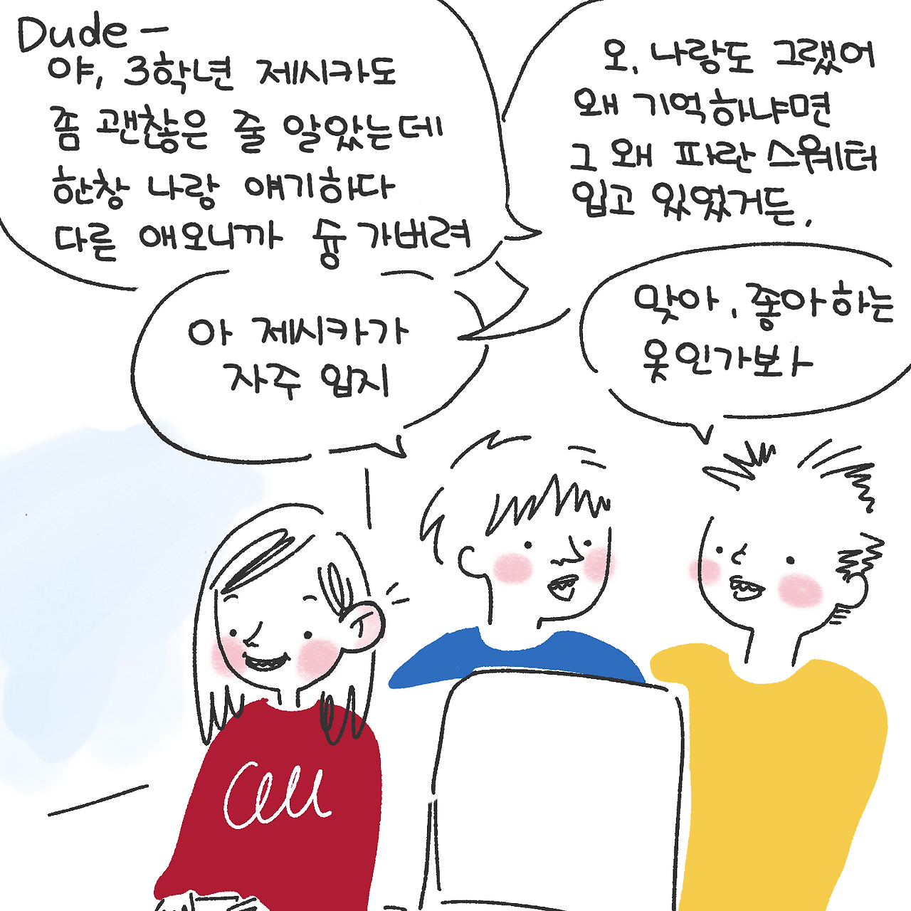 그 학생들은 치정극 이야기를 마치고서 1학년들을 한 번에 험담으로 깎아내리기 시작했다.