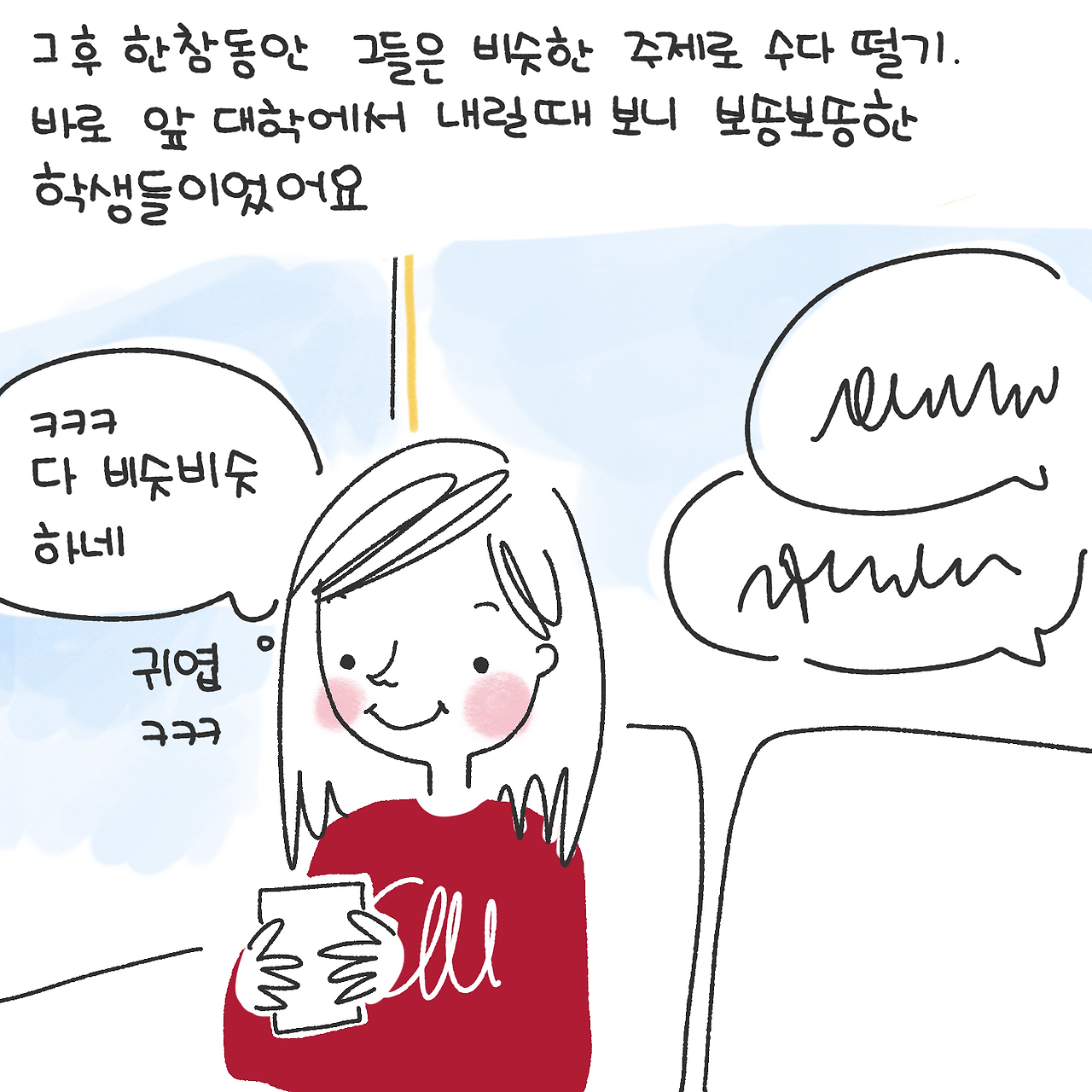 출근시간이라 보통은 다들 조용히 앉아 있는데 어느 날은 우리 바로 옆 학교 학생 둘이서 정말 신나게 수다를 떨기 시작했다. (2번째 버스부터였으니 그들은 약 40분간동안 수다를 떨었다.)