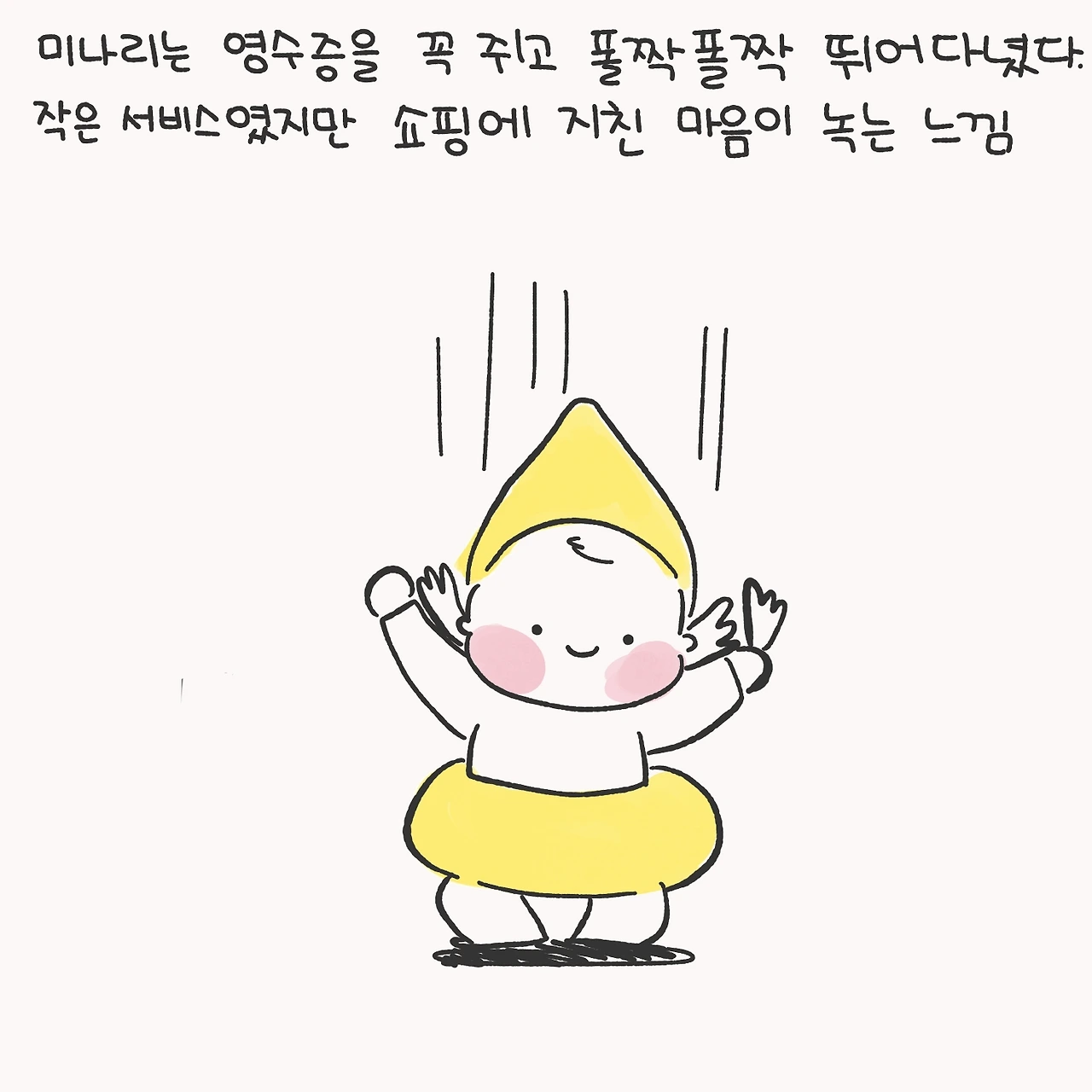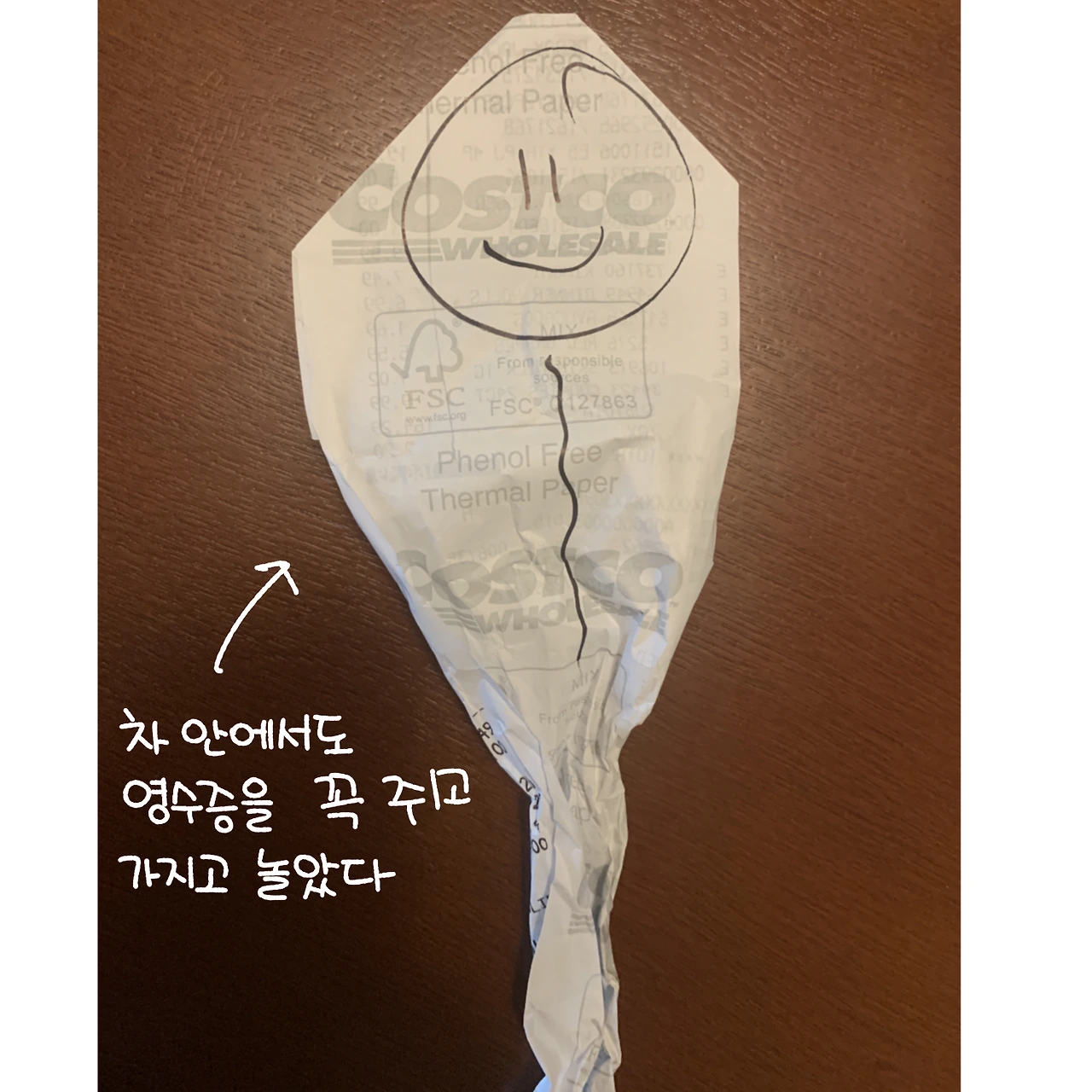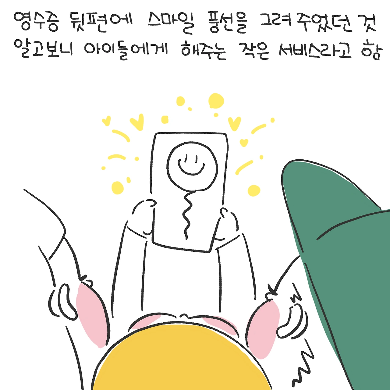 그런데 미나리가 영수증을 건네서인지 뒷면에 스마일 풍선을 그려준 작은 서비스가 감동이었다. 원래대로라면 피곤해서 미나리는 짜증을 내고 우리는 날카로웠을 집으로 오는 차 안의 분위기는 이 서비스 하나로 훈훈해졌다.