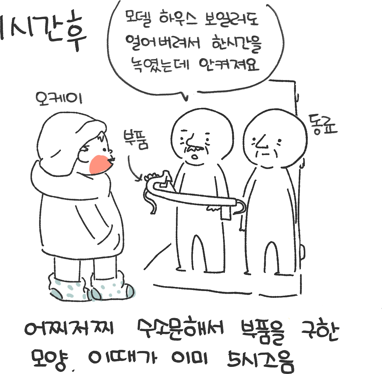 그렇게 어렵게 구한 부품으로 우리 보일러를 수리해 주셨다. 그때가 이미 5시가 넘은 상황.