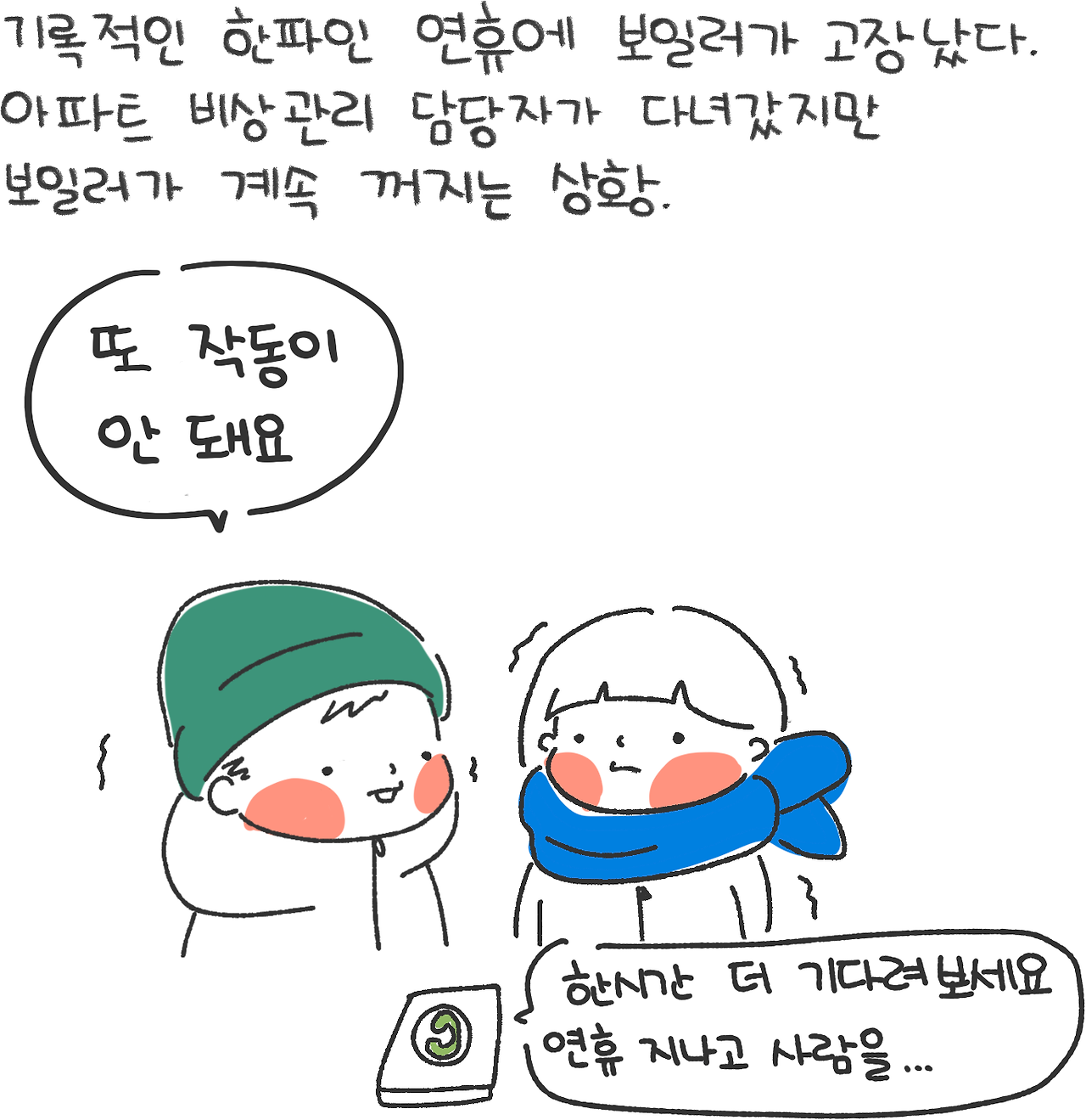 처음 히터가 고장 났을 땐 하필 다 쉴 때.라고 생각했는데 하필 이런 일이 생겨 오히려 따스한 온정을 느꼈다.