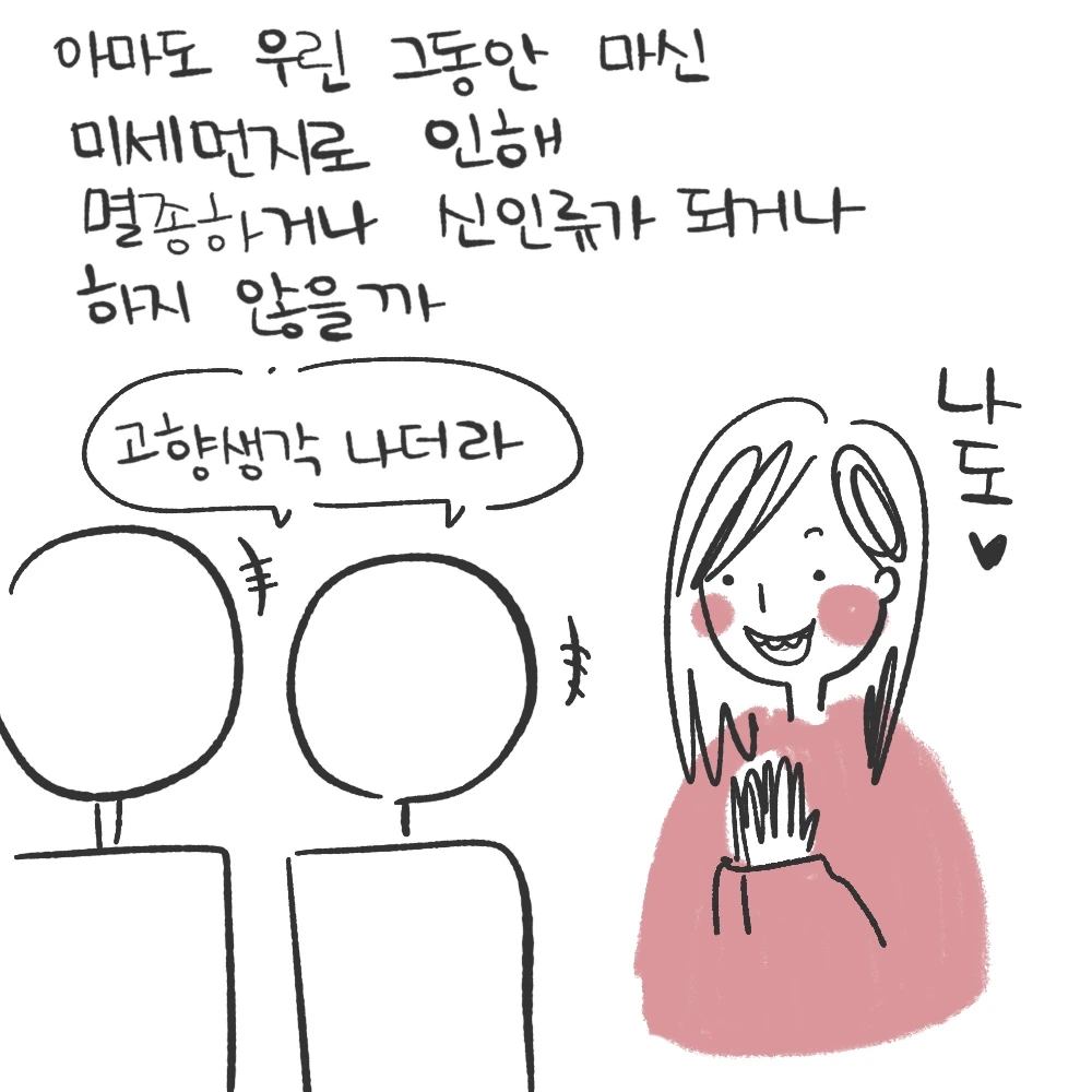 아마도 우리는 그동안 마신 미세먼지로 인해 멸종되거나 신인류가 되거나 하지 않을까.