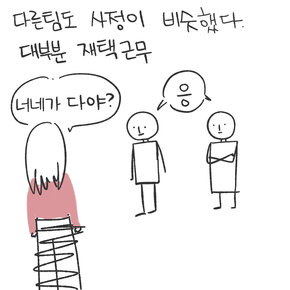 알고 보니 죄다 재택 근무를 신청했던 것. 다른 팀도 사정이 비슷했는데 대부분 재택근무 중이란다.